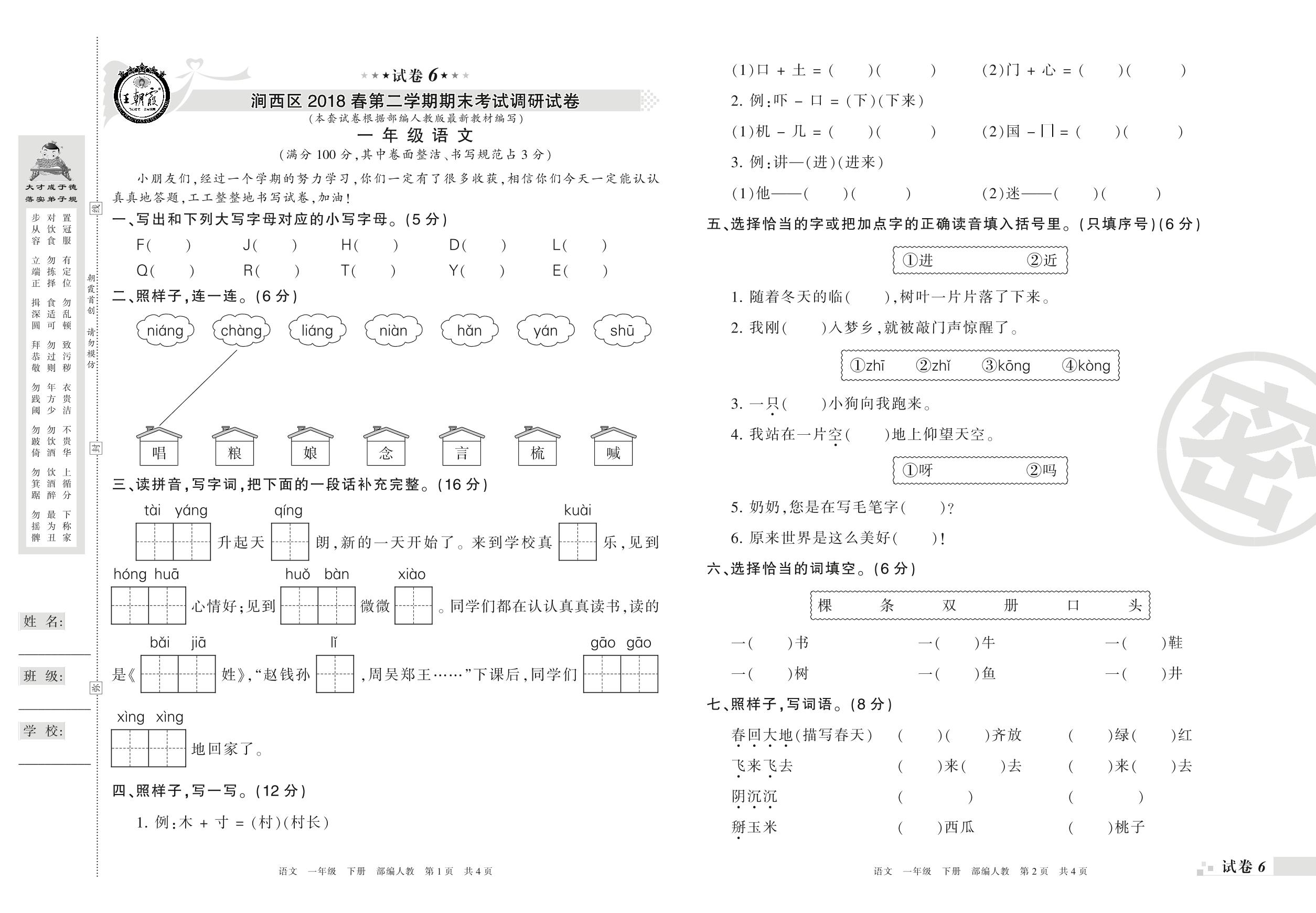 2016-2017学年第二学期洛阳市涧西区一年级语文试卷(人教版)【6】