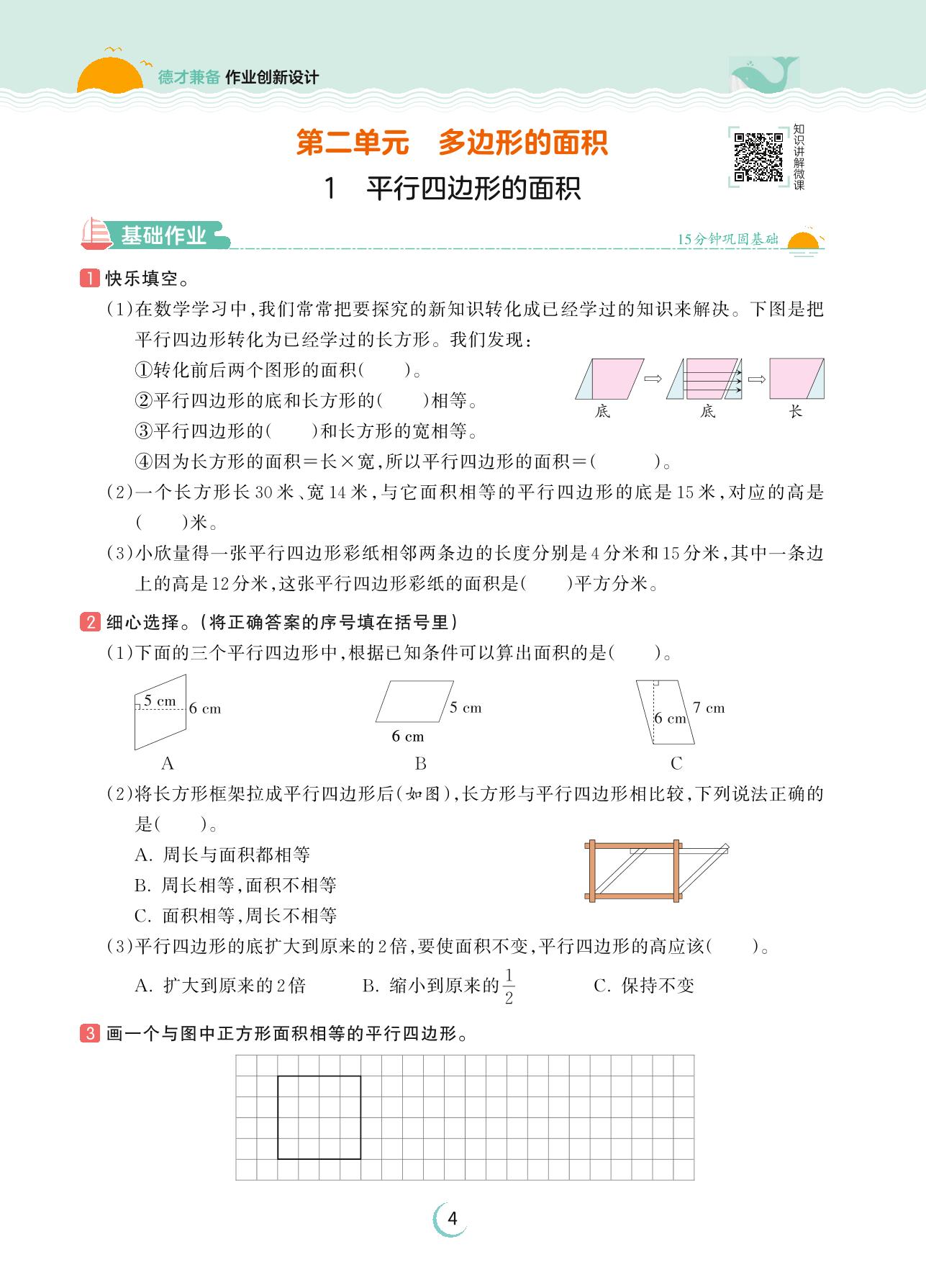 2023上册五年级数学苏教版 第二单元 多边形的面积——1 平行四边形的面积