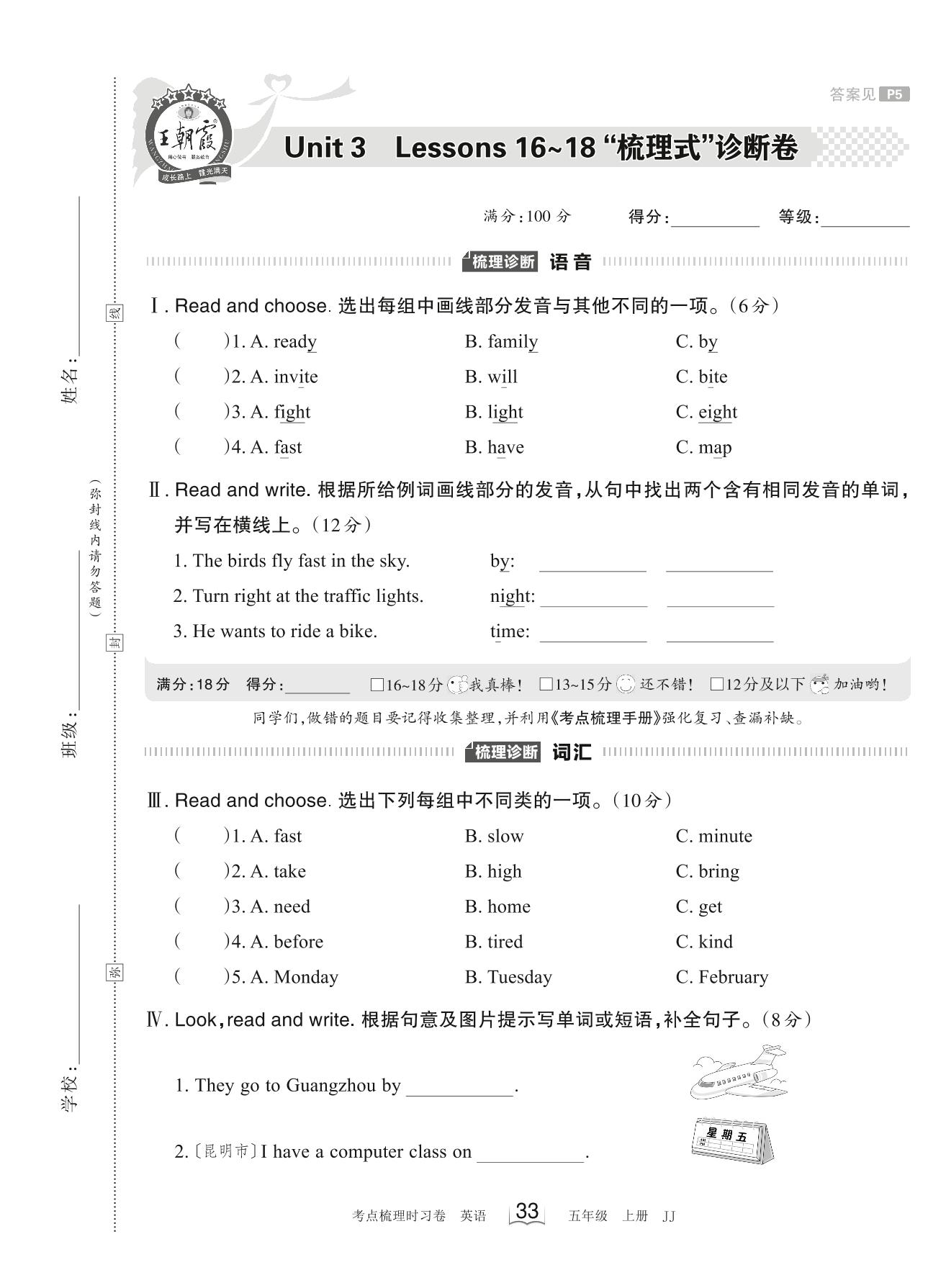 2023上册五年级英语冀教版 Unit 3 Lessons 16~18 “梳理式”诊断卷
