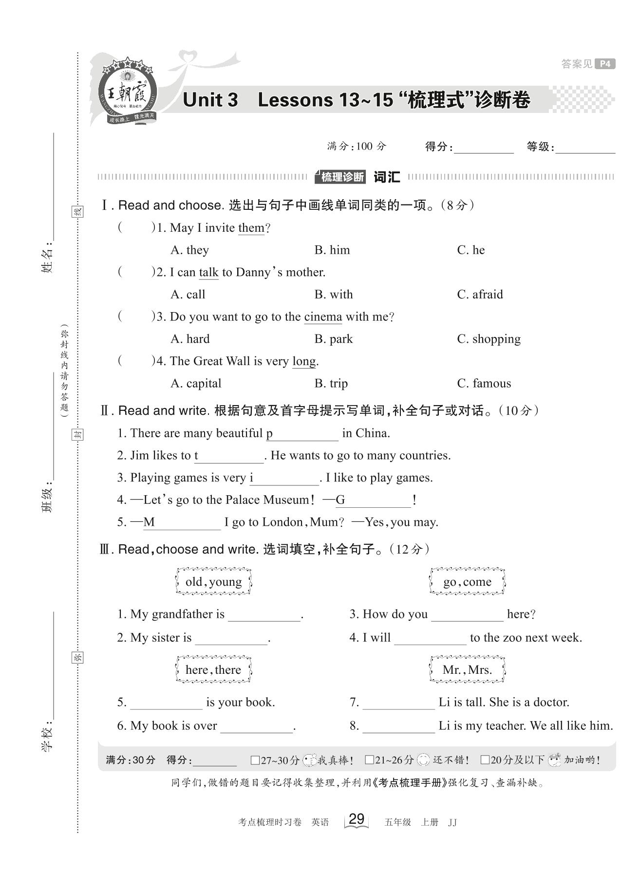 2023上册五年级英语冀教版 Unit 3 Lessons 13~15 “梳理式”诊断卷