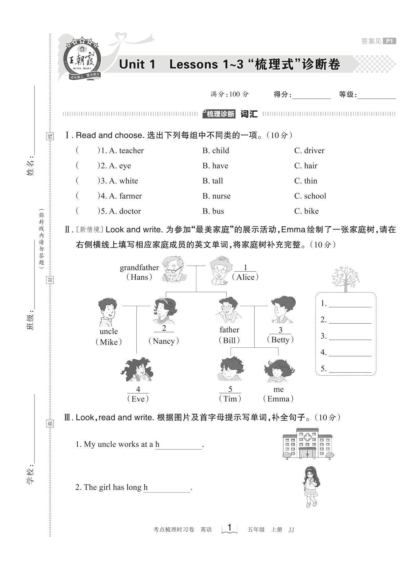2023上册五年级英语冀教版 Unit 1 Lessons 1~3 “梳理式”诊断卷