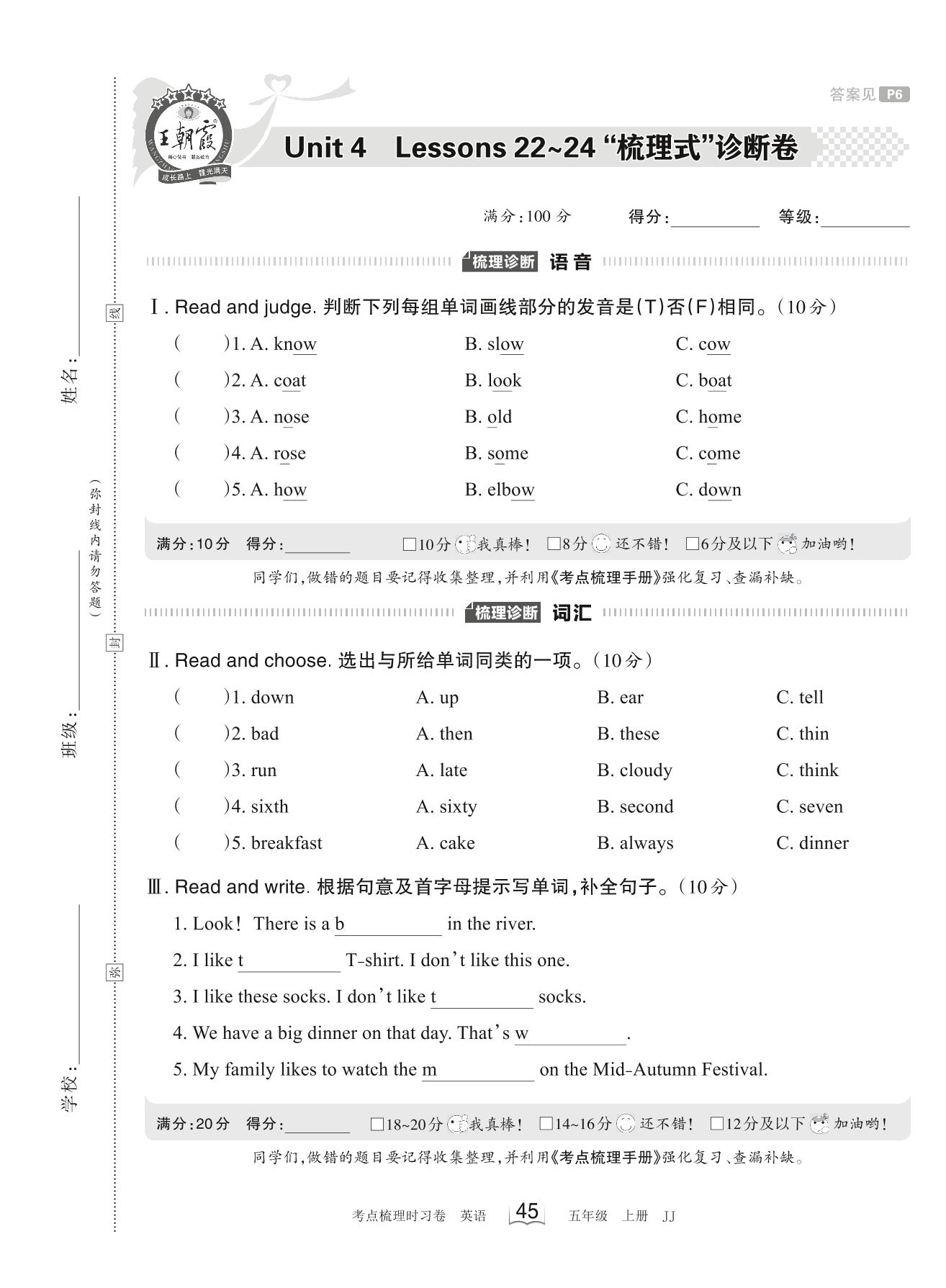 2023上册五年级英语冀教版 Unit 4 Lessons 22~24 “梳理式”诊断卷