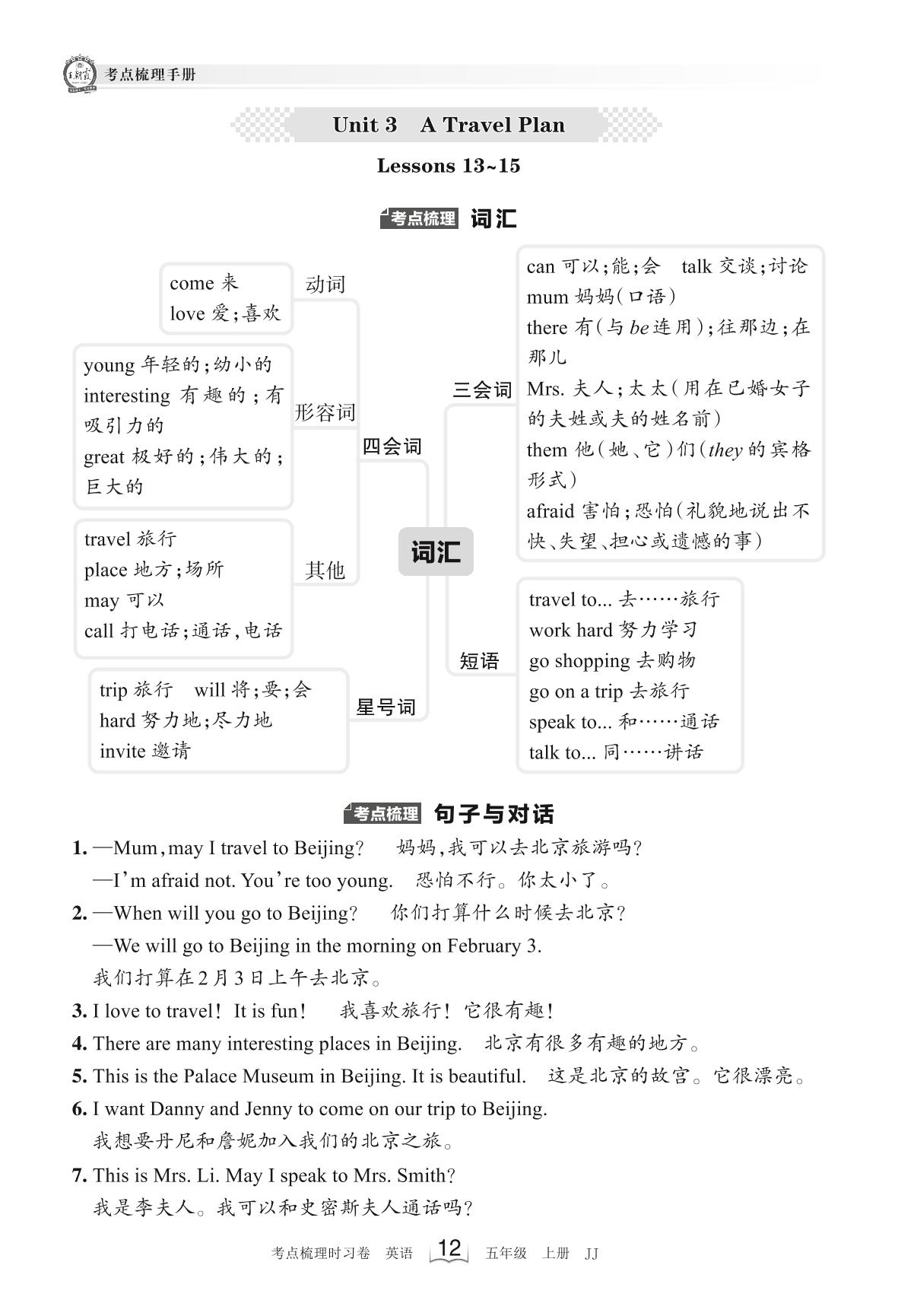 2023上册五年级英语冀教版 考点梳理手册——Unit 3 Lessons 13~15