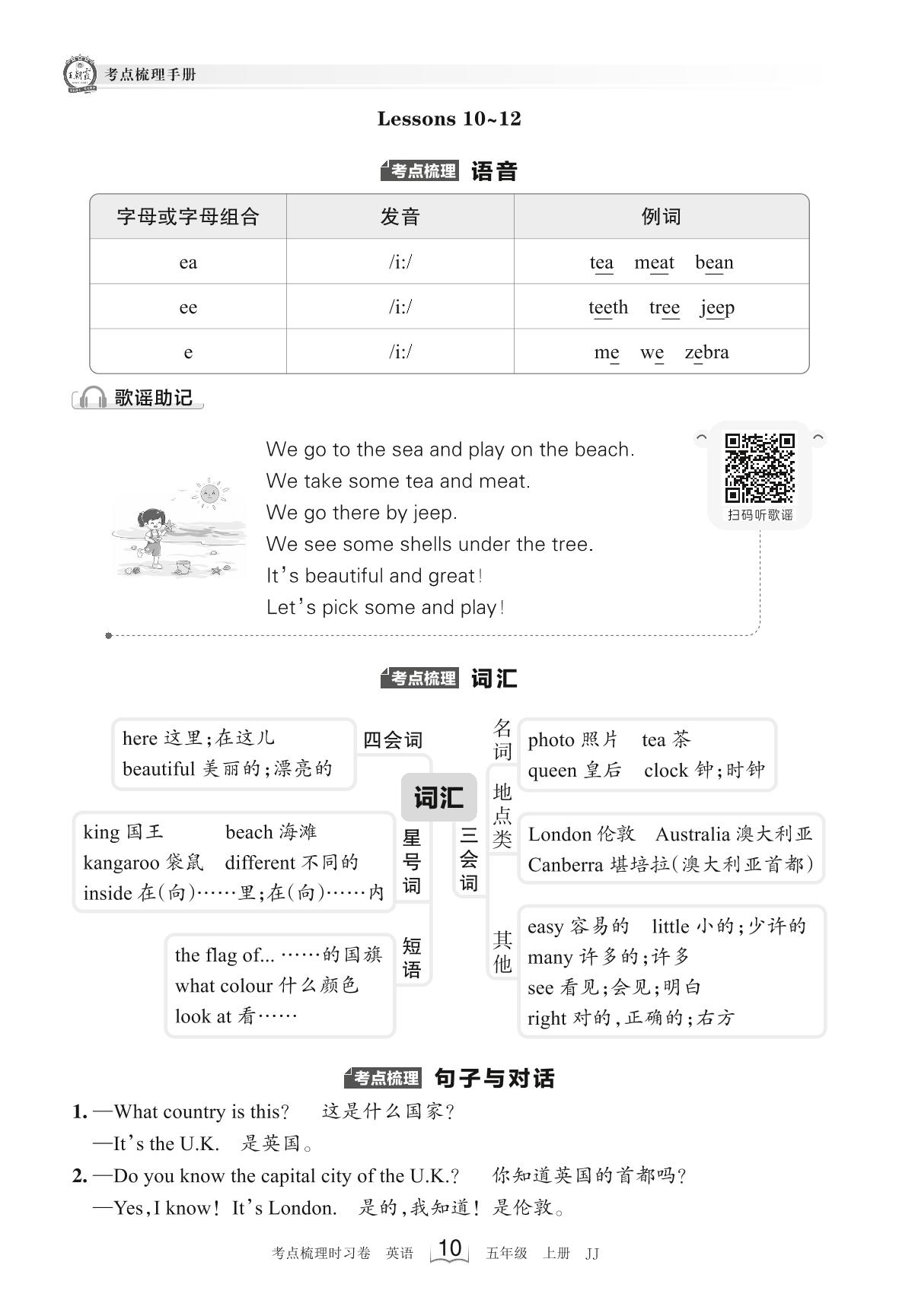 2023上册五年级英语冀教版 考点梳理手册——Unit 2 Lessons 10~12