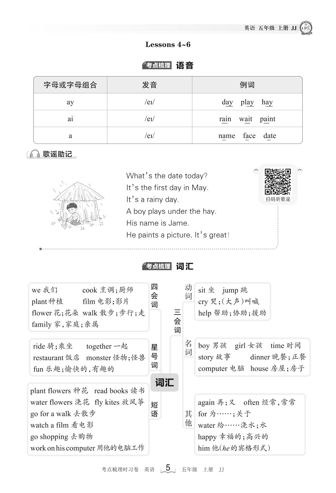 2023上册五年级英语冀教版 考点梳理手册——Unit 1 Lessons 4~6