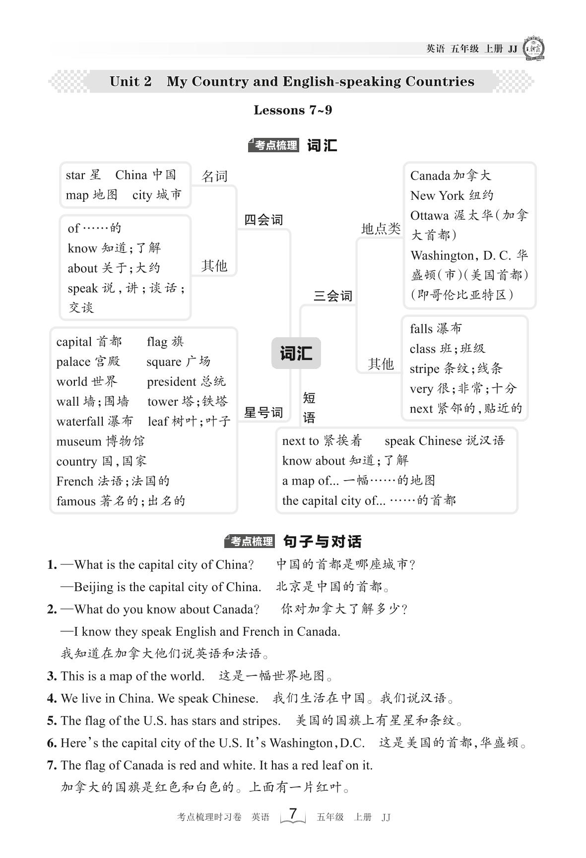 2023上册五年级英语冀教版 考点梳理手册——Unit 2 Lessons 7~9
