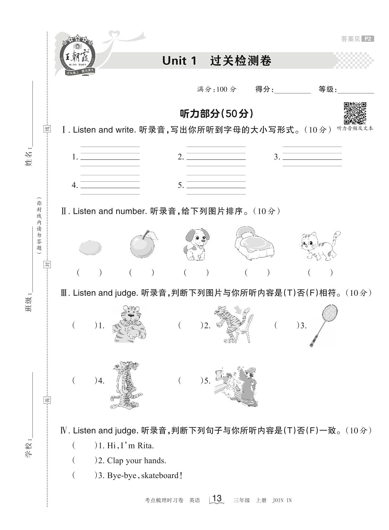 2023上册三年级英语剑桥版 Unit 1 过关检测卷
