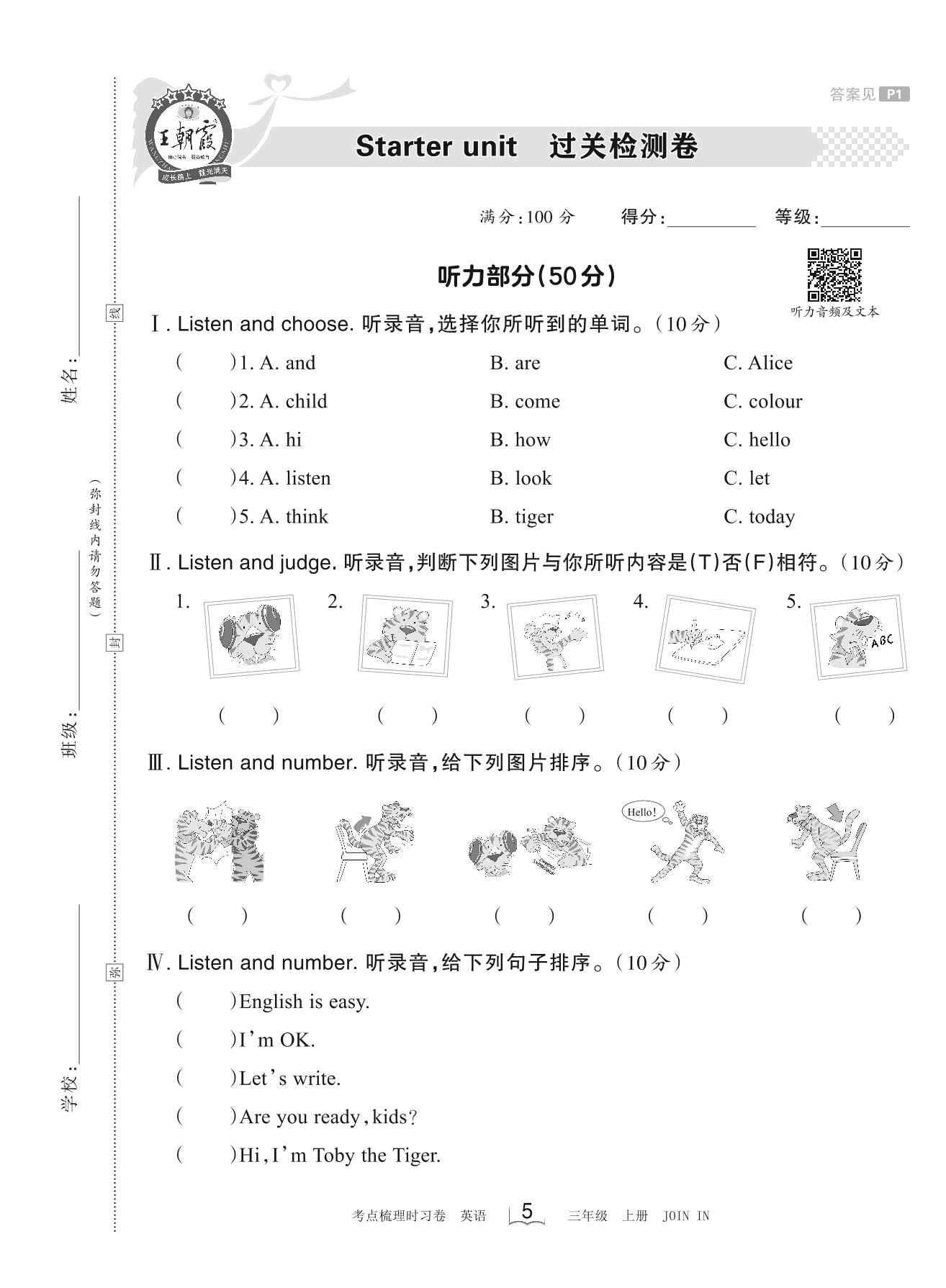 2023上册三年级英语剑桥版 Starter unit 过关检测卷