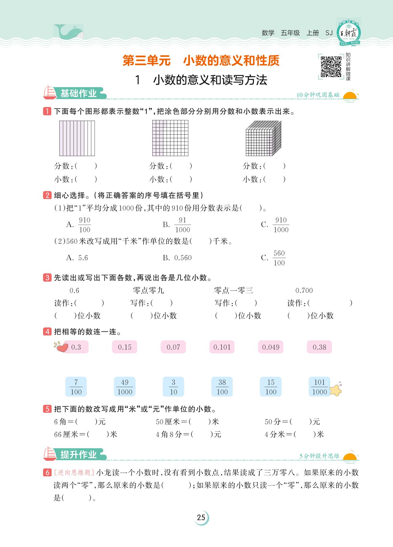 2023上册五年级数学苏教版 第三单元 小数的意义和性质——1 小数的意义和读写方法