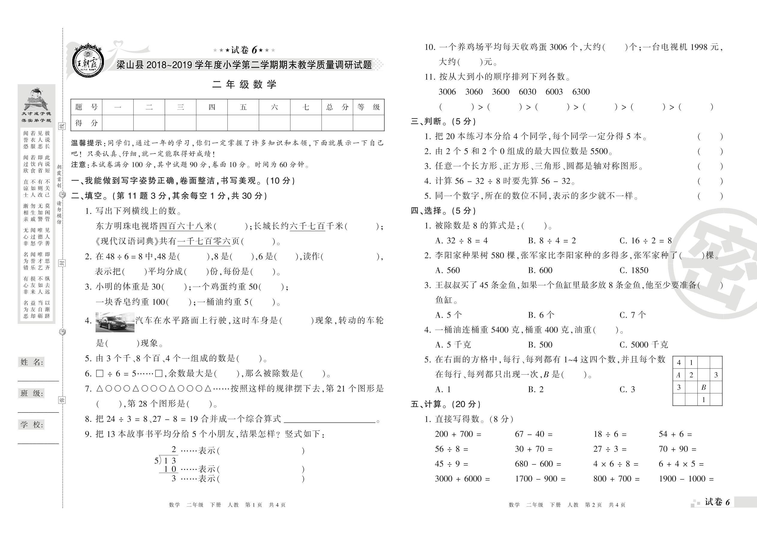 2018-2019学年第二学期济宁市梁山县二年级数学试卷(人教版)【6】
