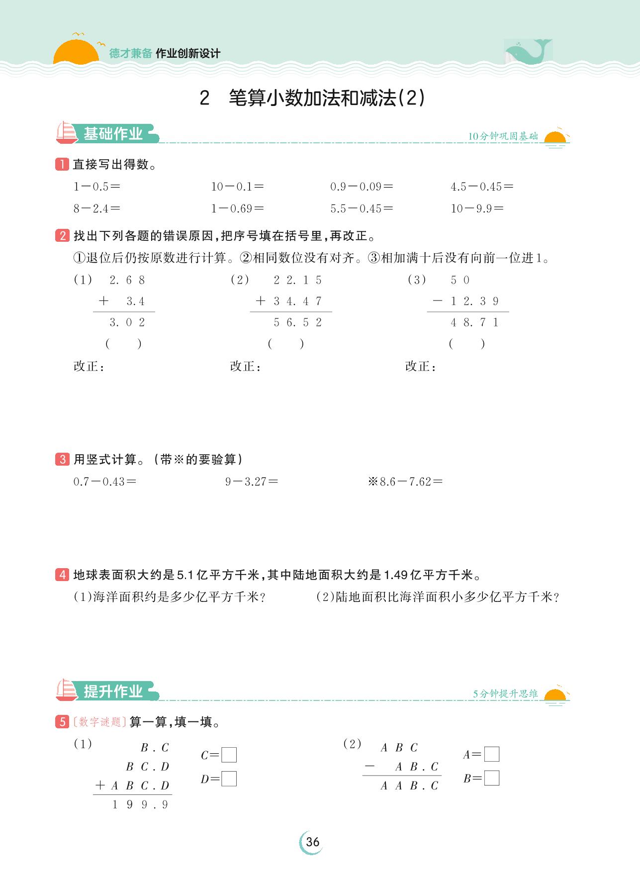 2023上册五年级数学苏教版 第四单元 小数加法和减法——2 笔算小数加法和减法(2)