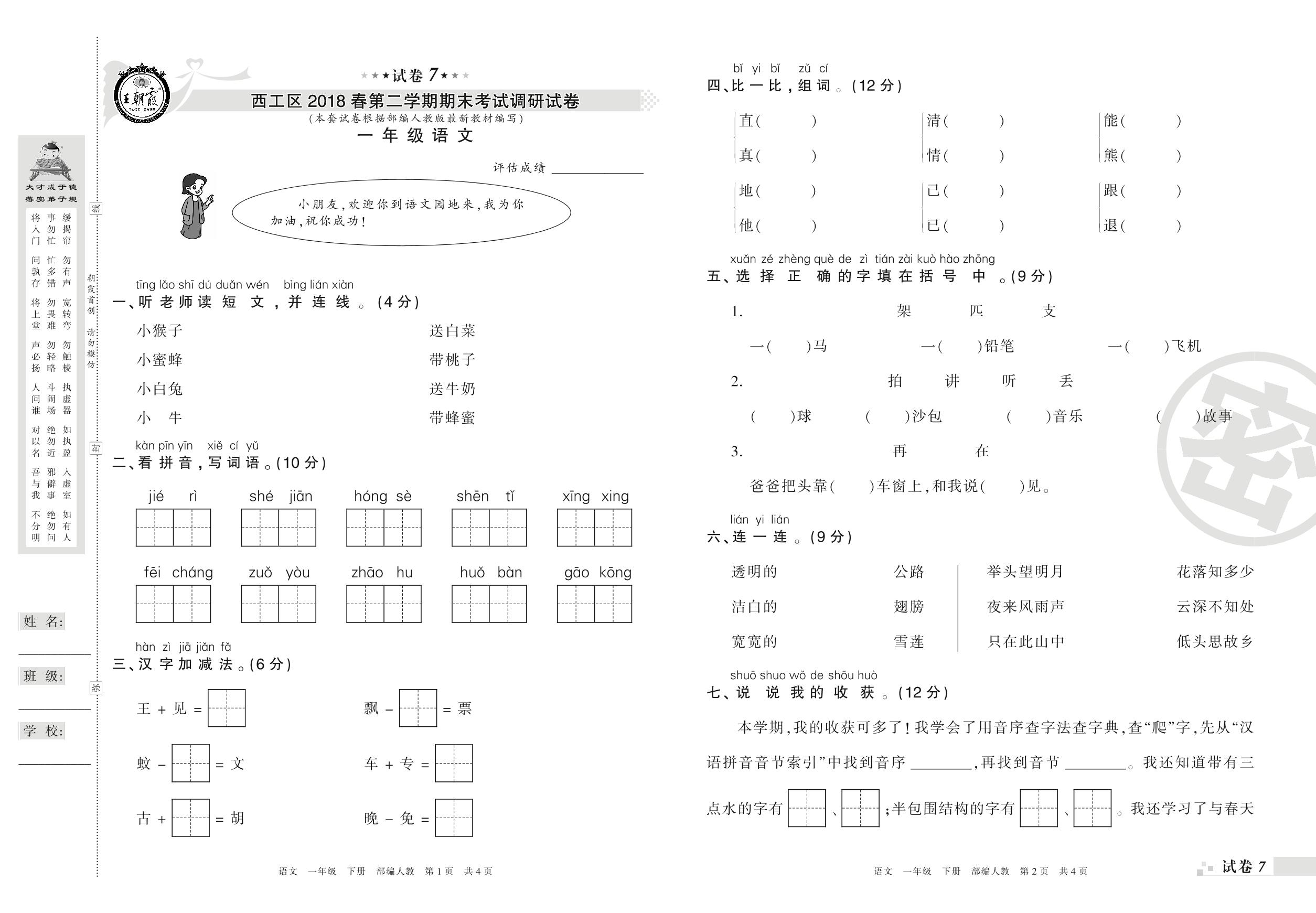 2016-2017学年第二学期洛阳市西工区一年级语文试卷(人教版)【7】