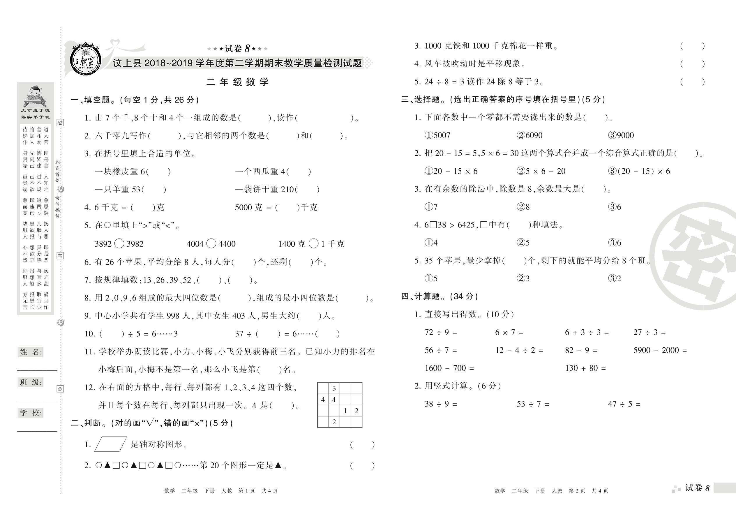 2018-2019学年第二学期济宁市汶上县二年级数学试卷(人教版)【8】