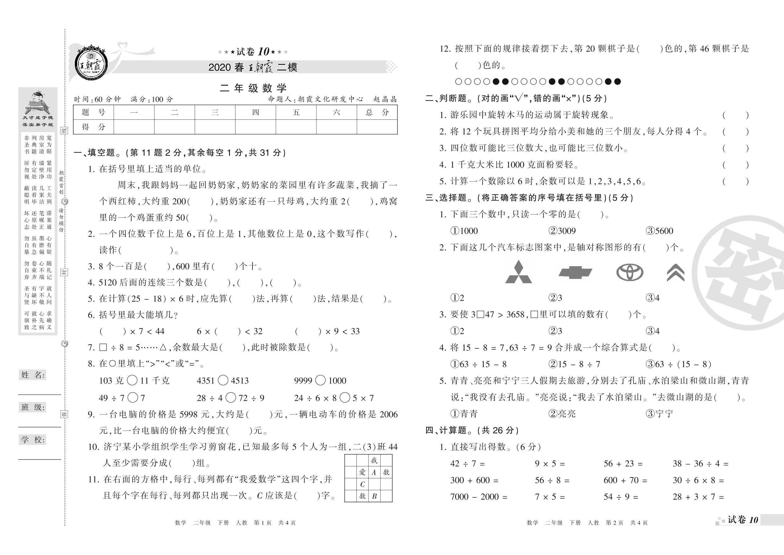 王朝霞期末模拟卷二年级下册数学(人教版)_R21080390751【10】