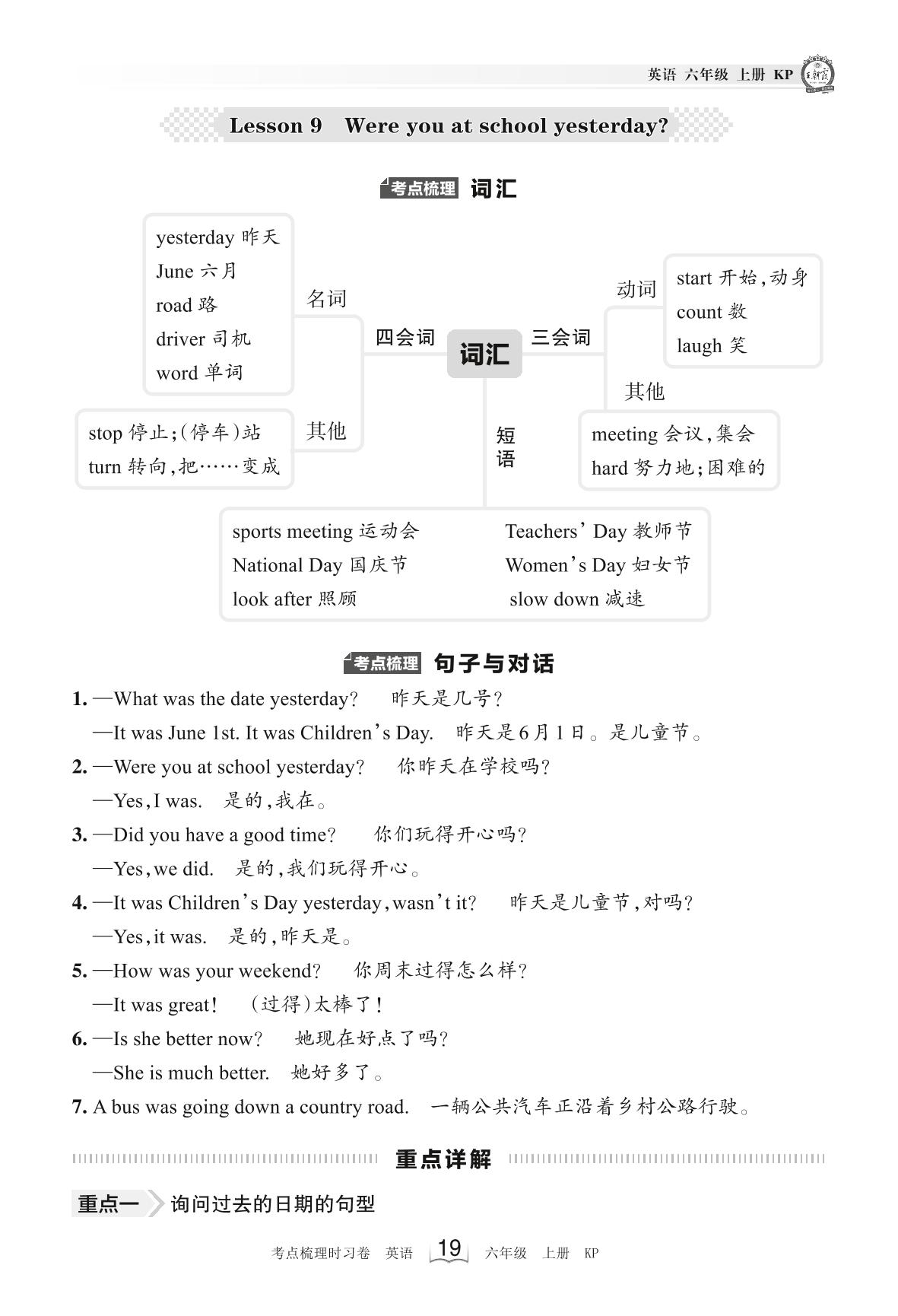 2023上册六年级英语科普版 考点梳理手册——Lesson 9 Were you at school yesterday