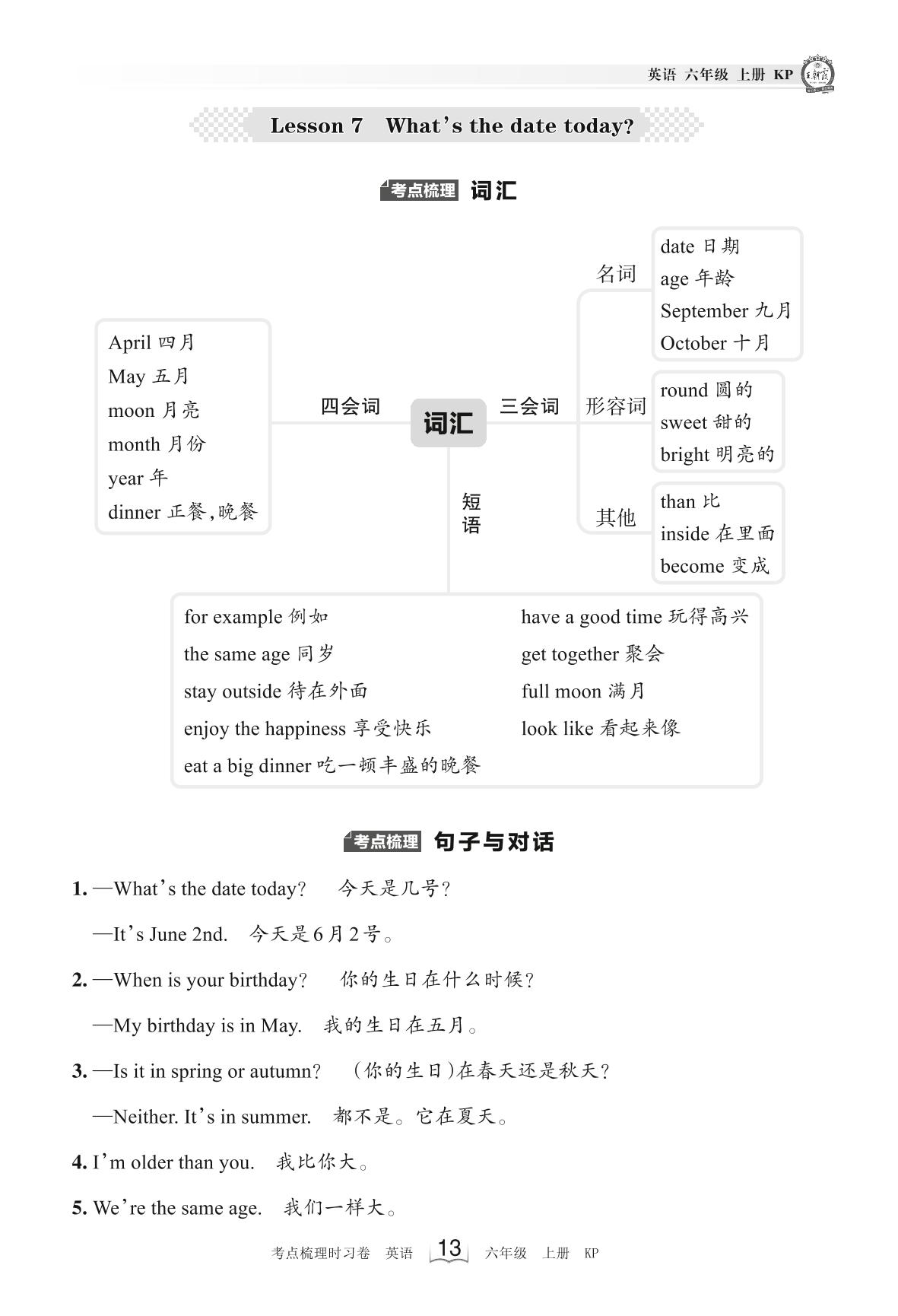 2023上册六年级英语科普版 考点梳理手册——Lesson 7 What’s the date today?