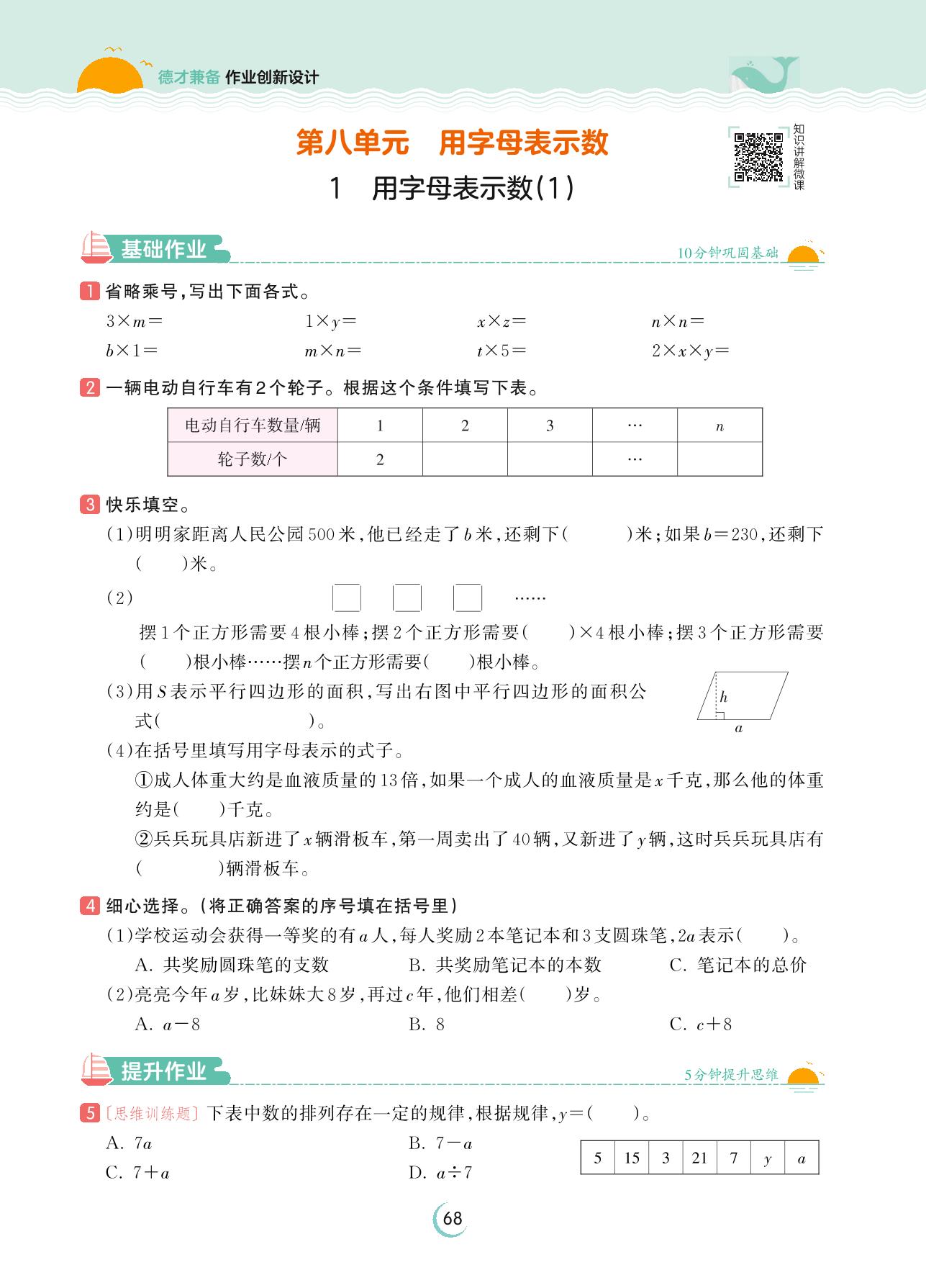 2023上册五年级数学苏教版 第八单元 用字母表示数——1 用字母表示数(1)