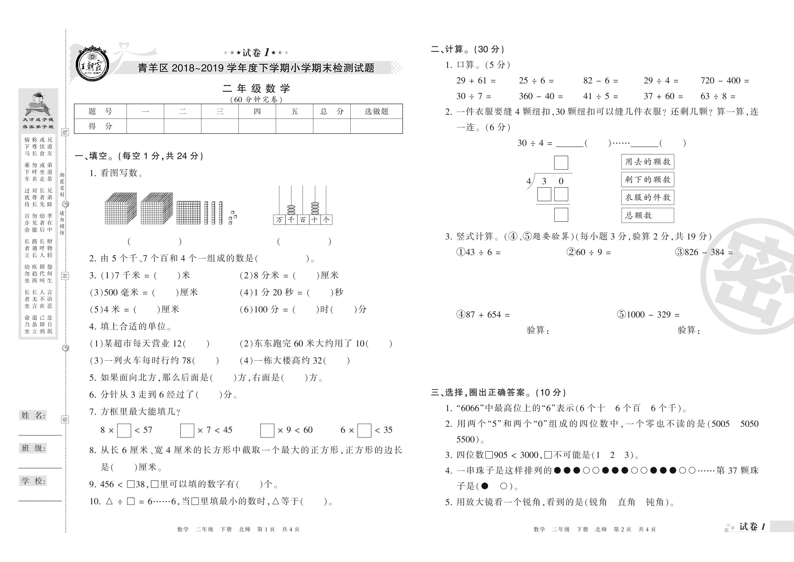 2018-2019学年第二学期成都市青羊区二年级数学试卷(北师版)【1】