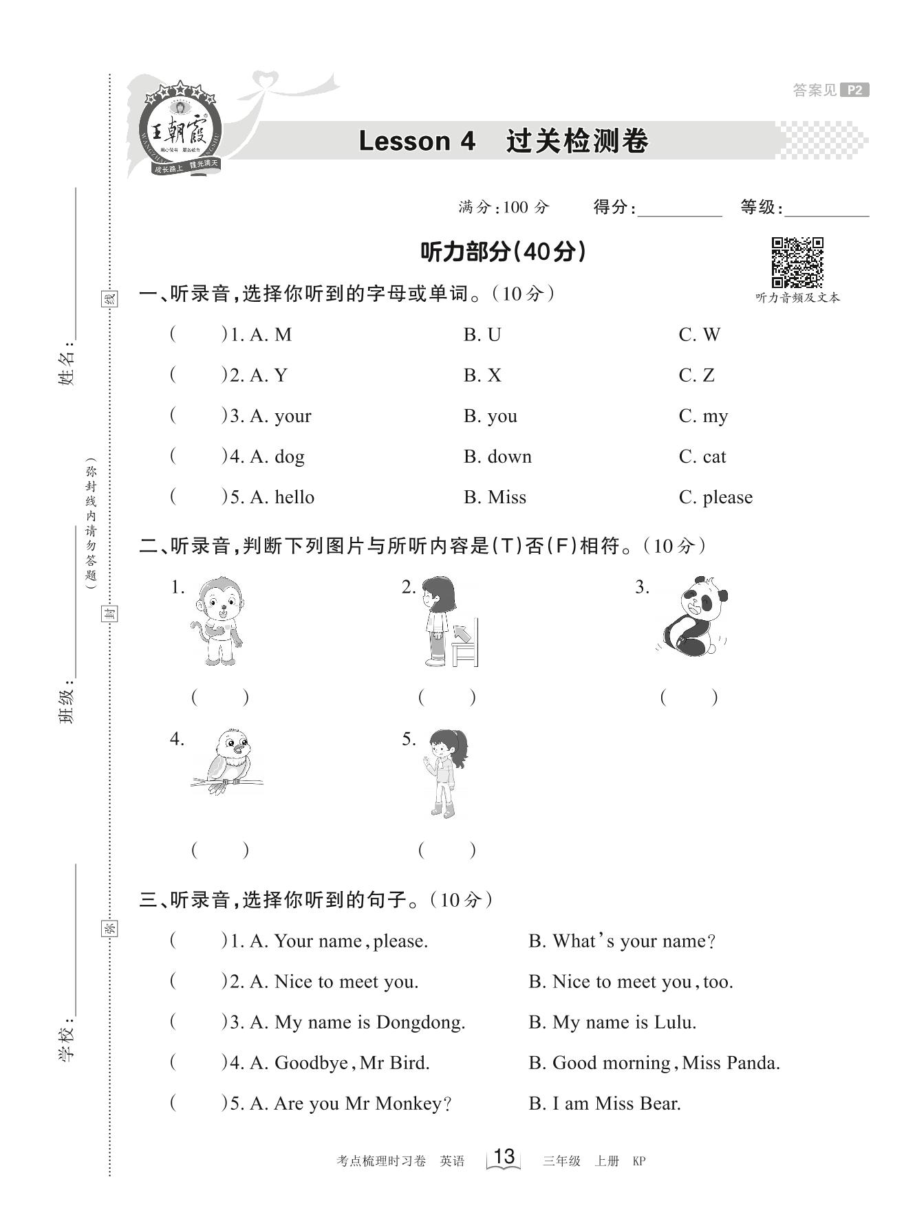 2023上册三年级英语科普版 Lesson 4 过关检测卷