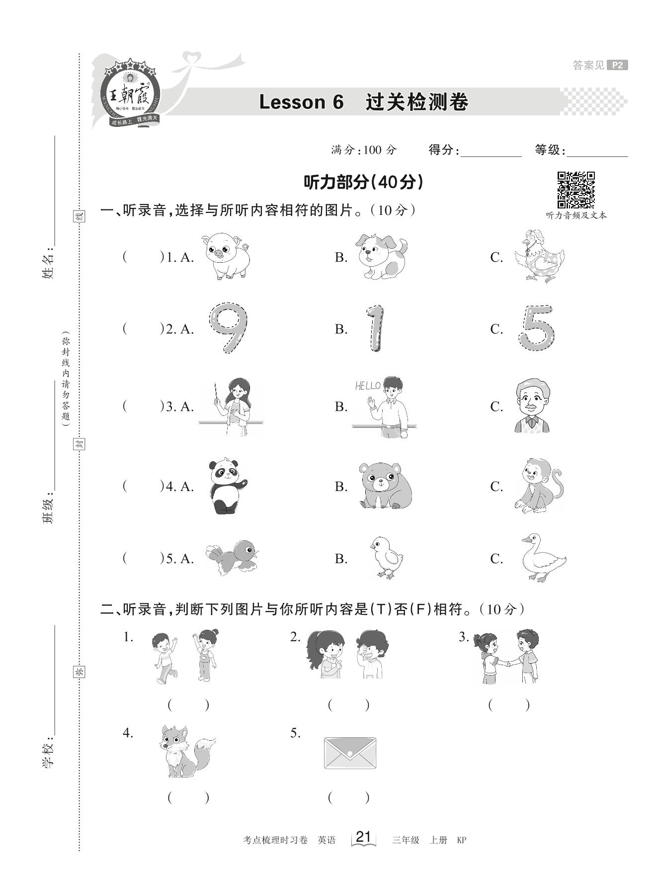 2023上册三年级英语科普版 Lesson 6 过关检测卷