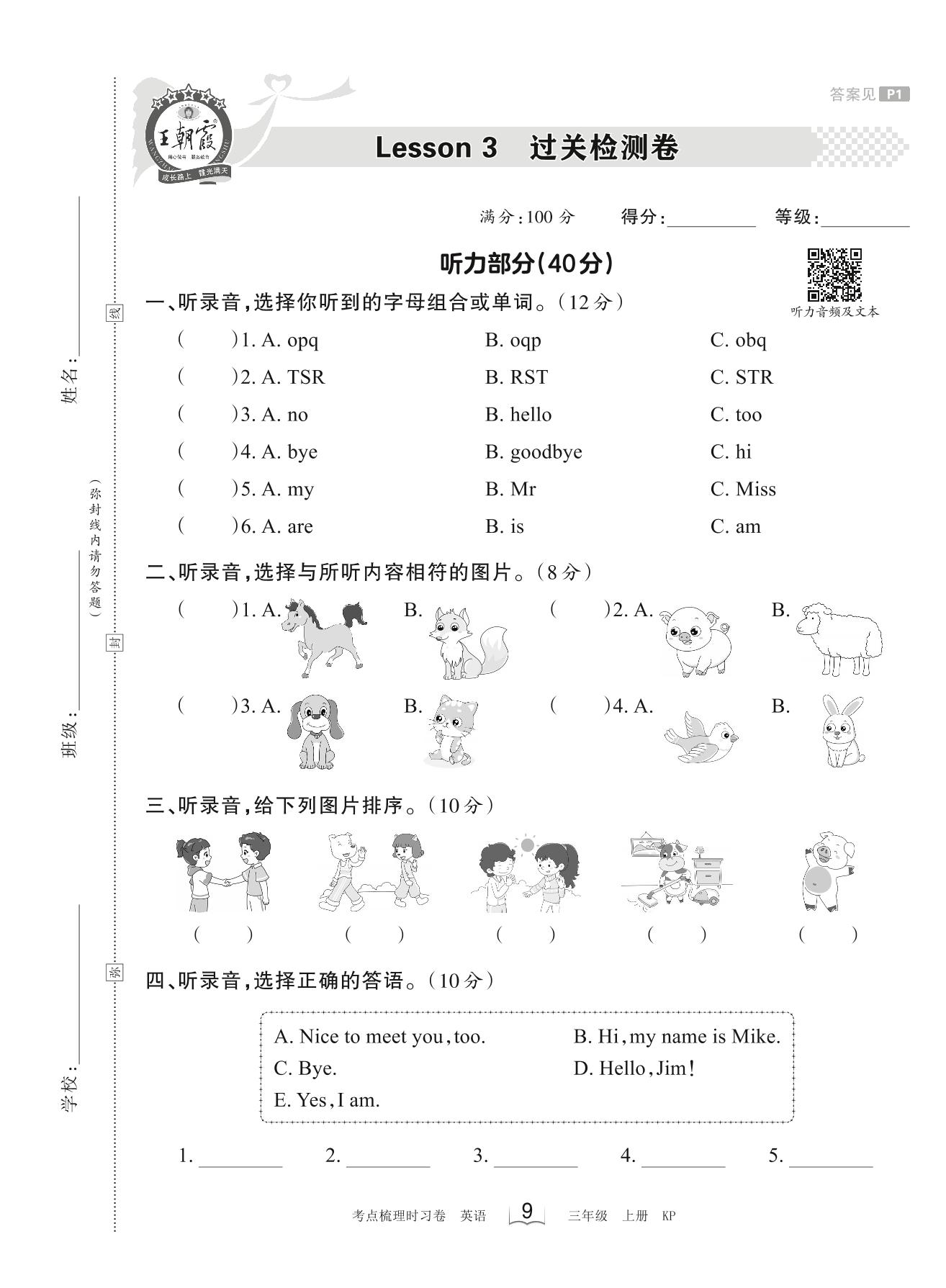 2023上册三年级英语科普版 Lesson 3 过关检测卷