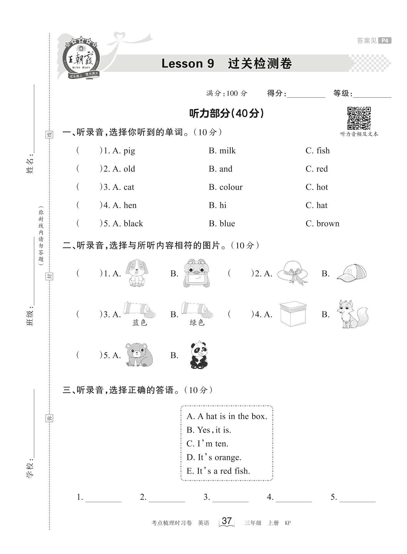2023上册三年级英语科普版 Lesson 9 过关检测卷