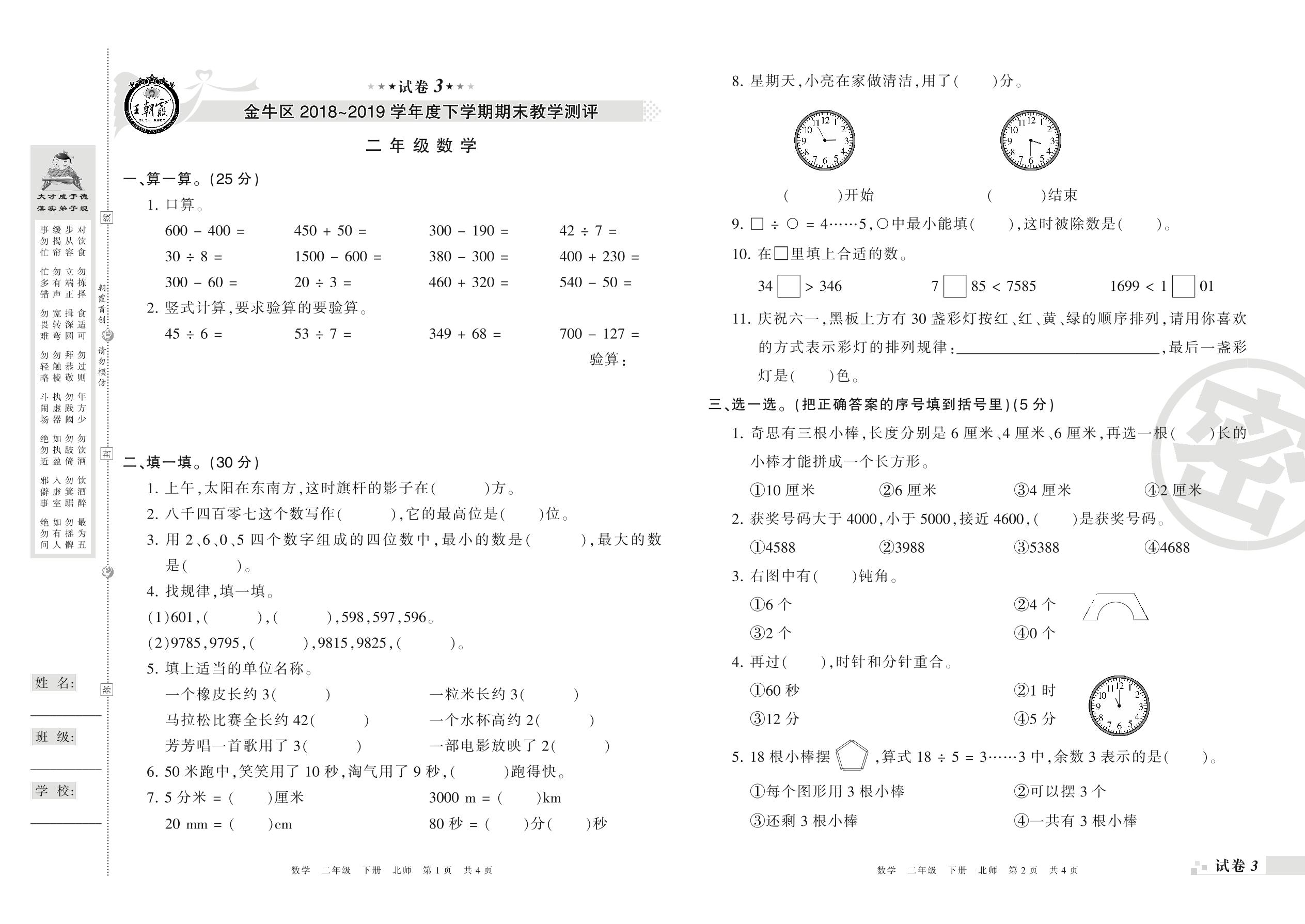 2018-2019学年第二学期成都市金牛区二年级数学试卷(北师版)【3】