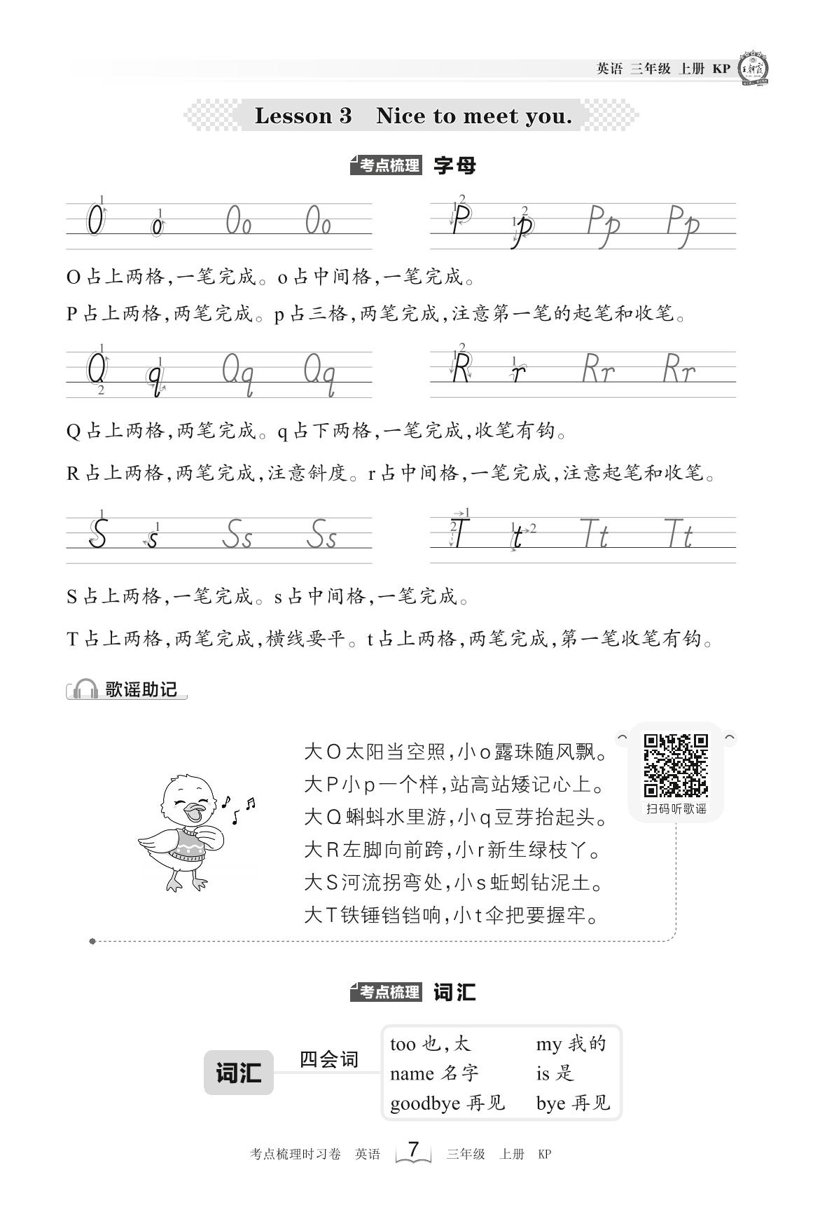 2023上册三年级英语科普版 考点梳理手册——Lesson 3 Nice to meet you.