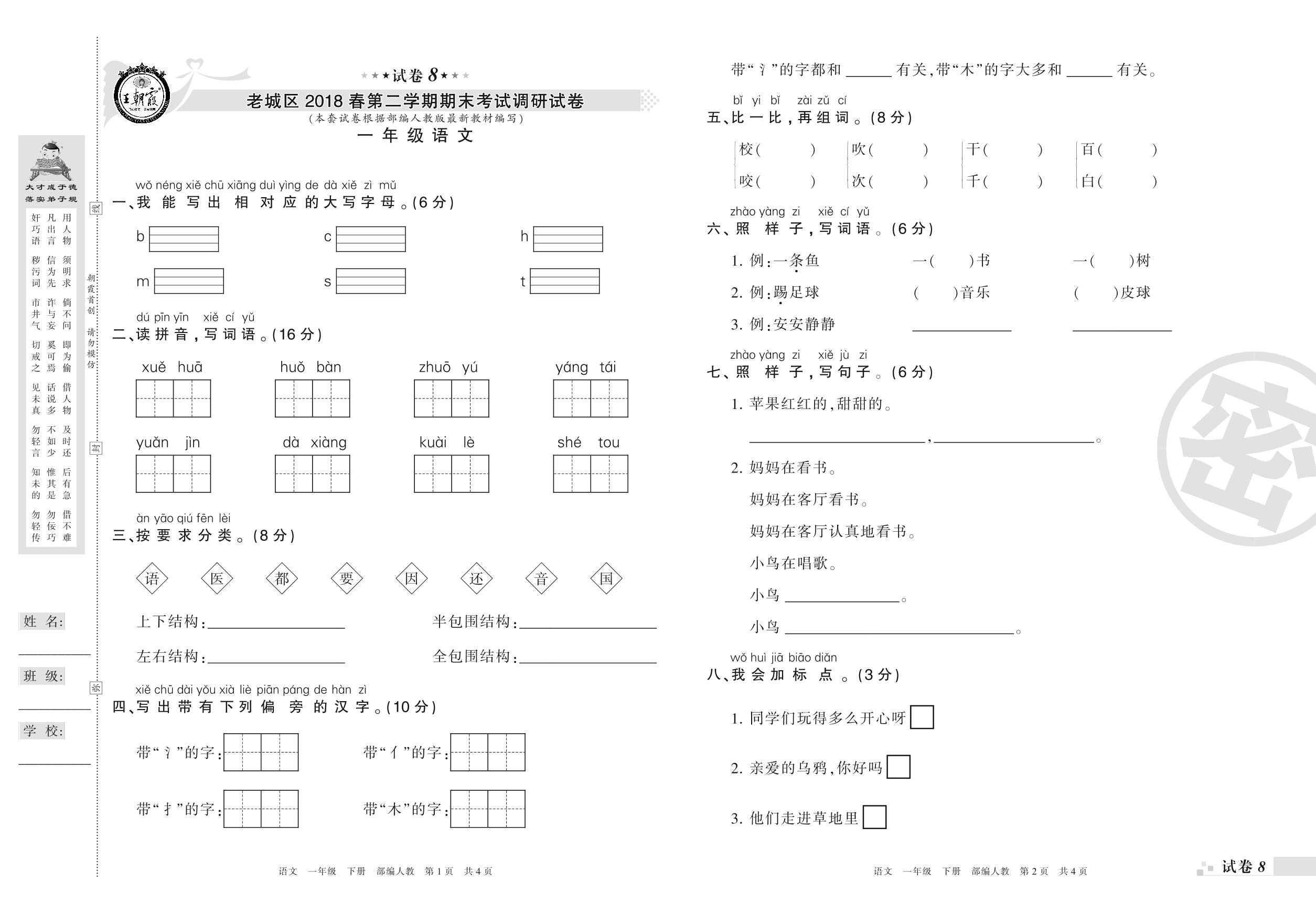 2016-2017学年第二学期洛阳市老城区一年级语文试卷(人教版)【8】