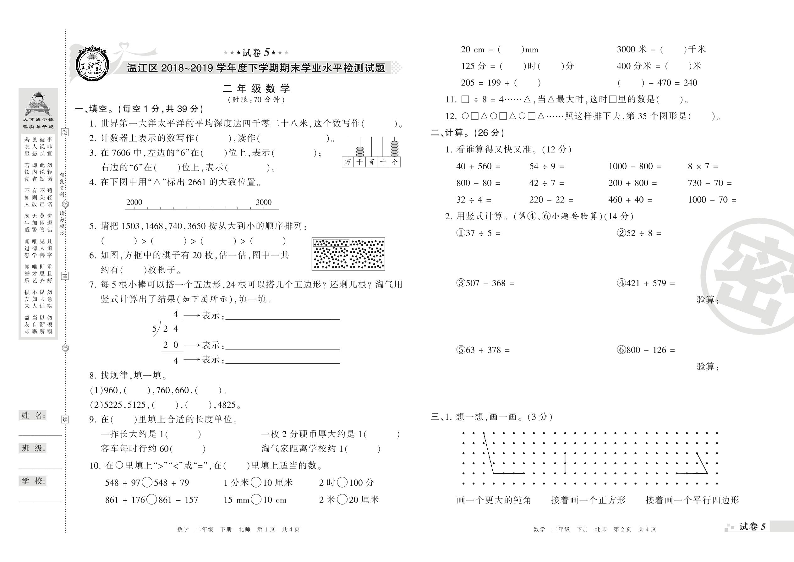 2018-2019学年第二学期成都市温江区二年级数学试卷(北师版)【5】