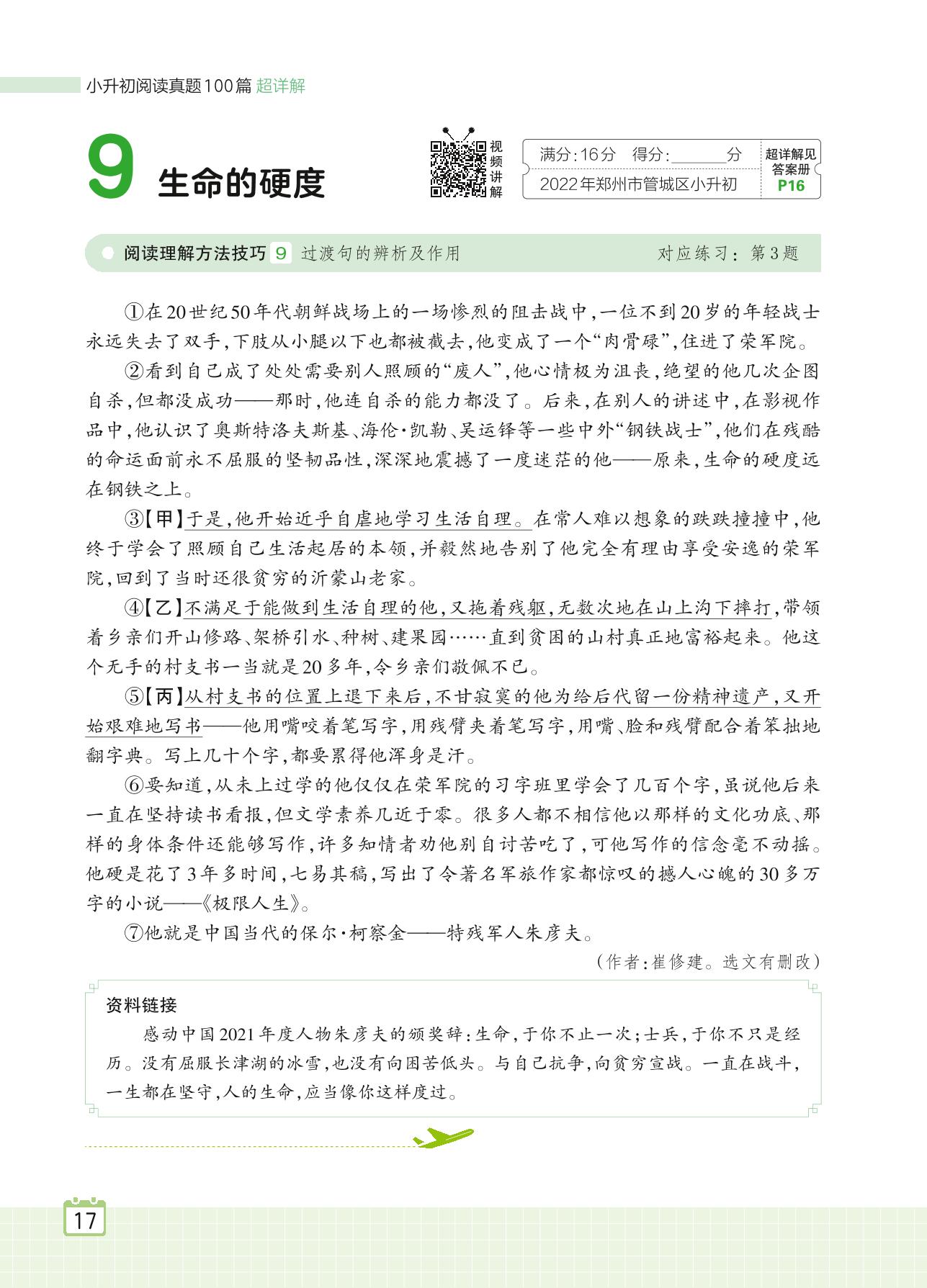 2024全一册六年级语文人教版 专题一 写人 9 生命的硬度