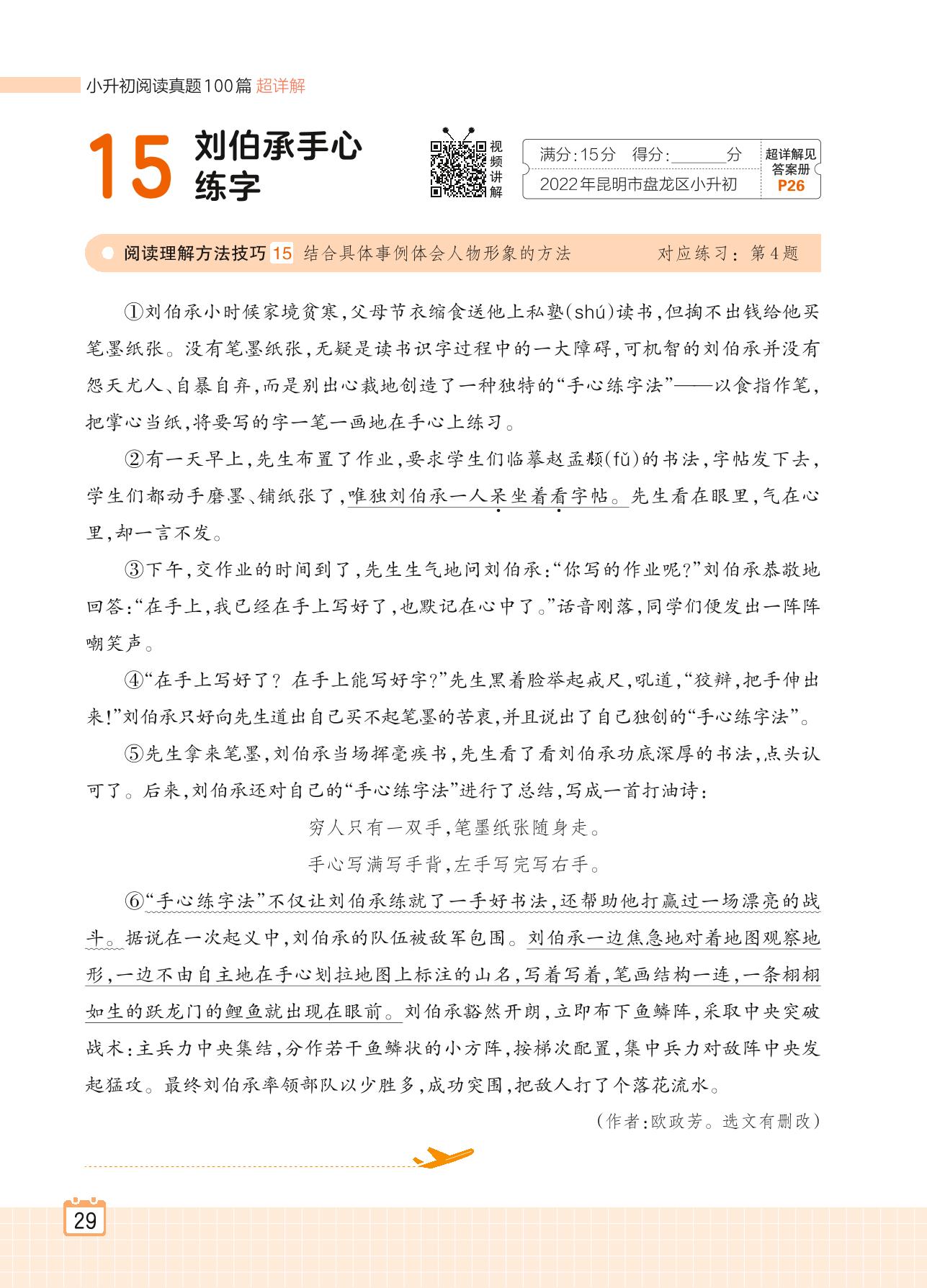 2024全一册六年级语文人教版 专题二 叙事 15 刘伯承手心练字