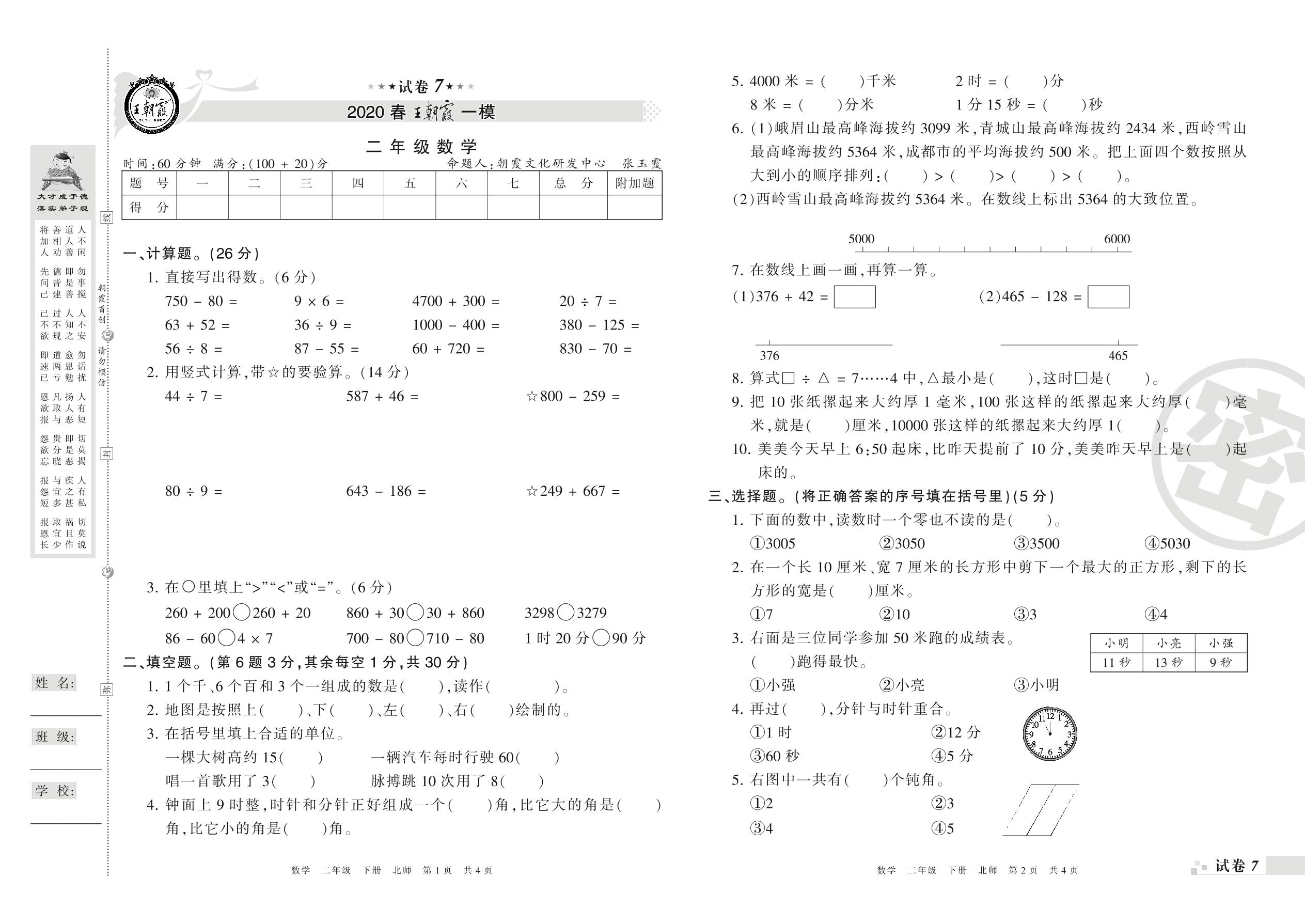 王朝霞期末模拟卷二年级下册数学(北师版)_R21080390835【7】