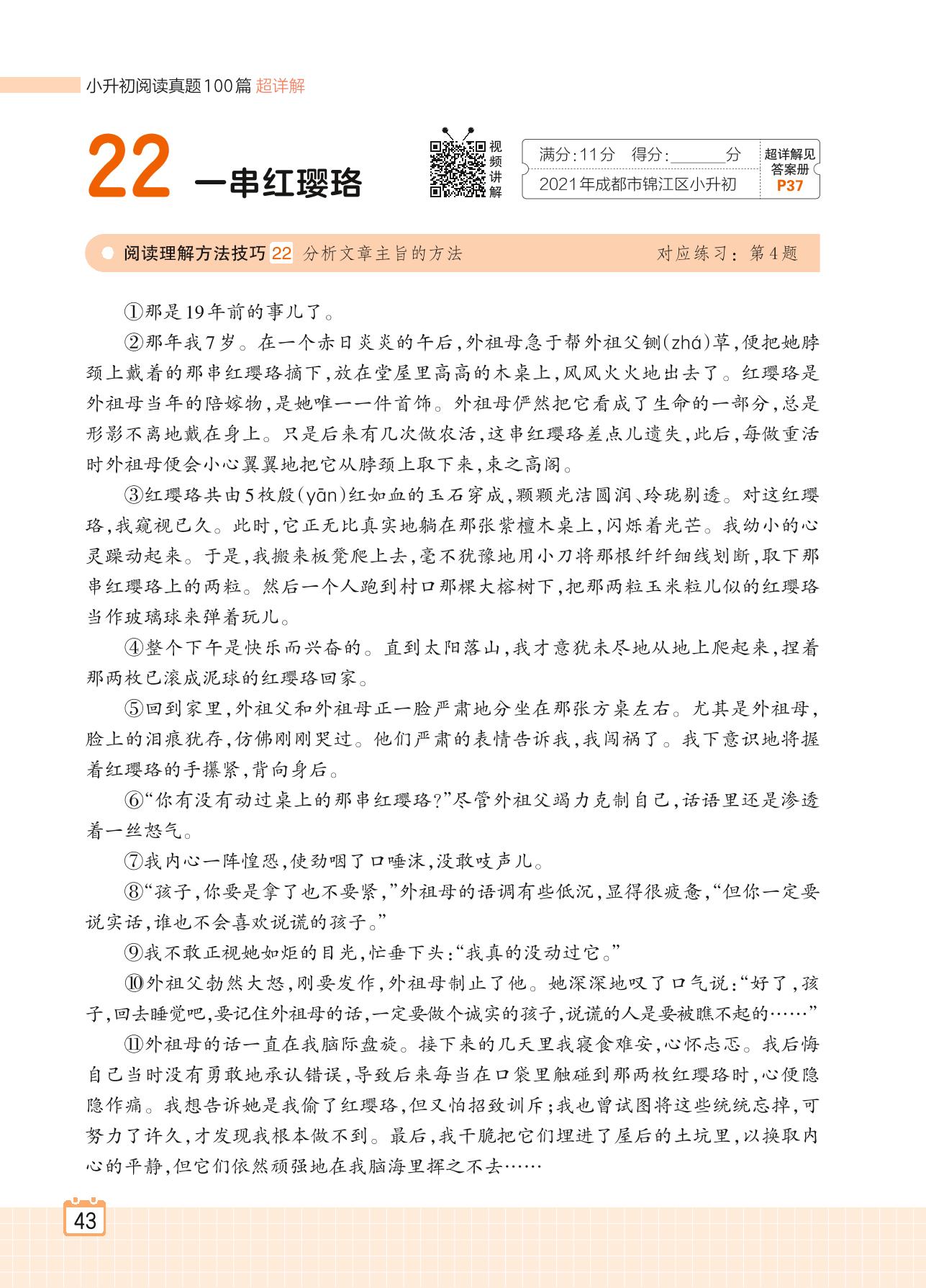 2024全一册六年级语文人教版 专题二 叙事 22 一串红璎珞