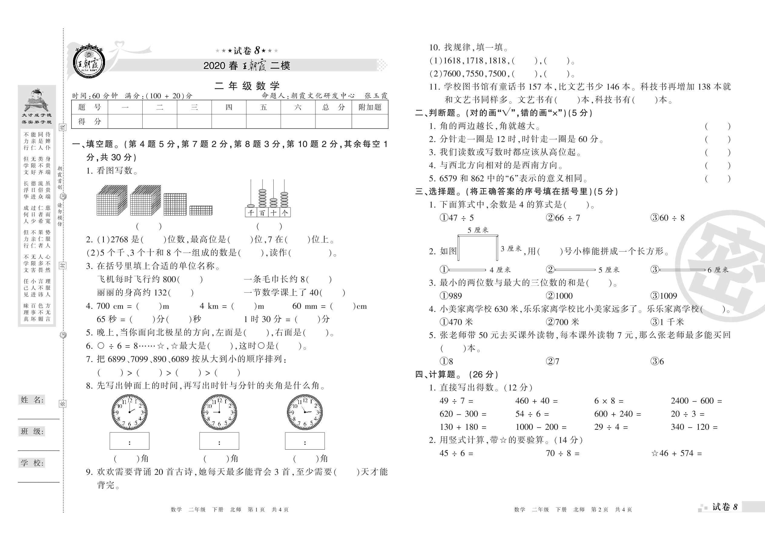 王朝霞期末模拟卷二年级下册数学(北师版)_R21080390841【8】