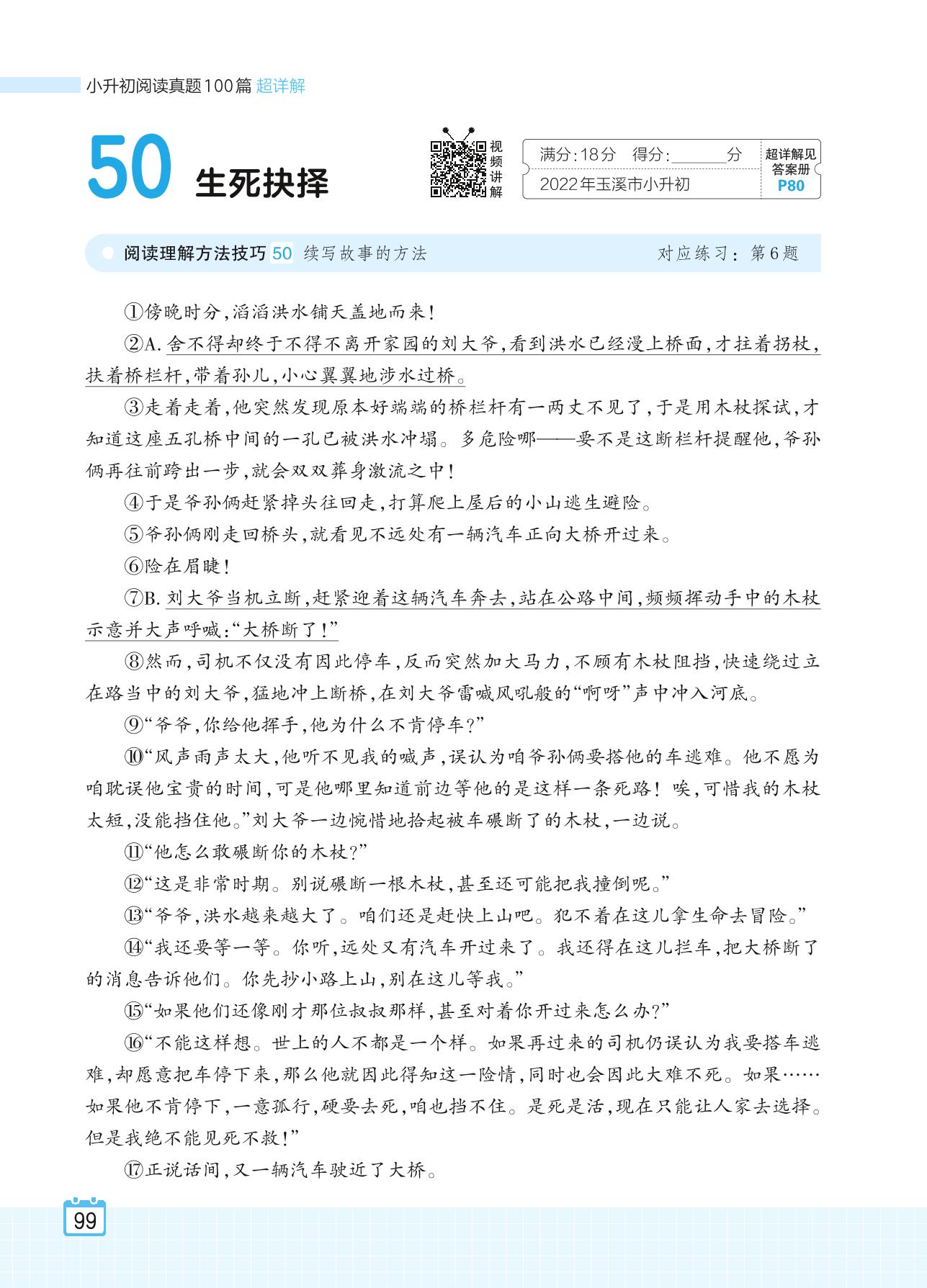 2024全一册六年级语文人教版 专题五 小说 50 生死抉择