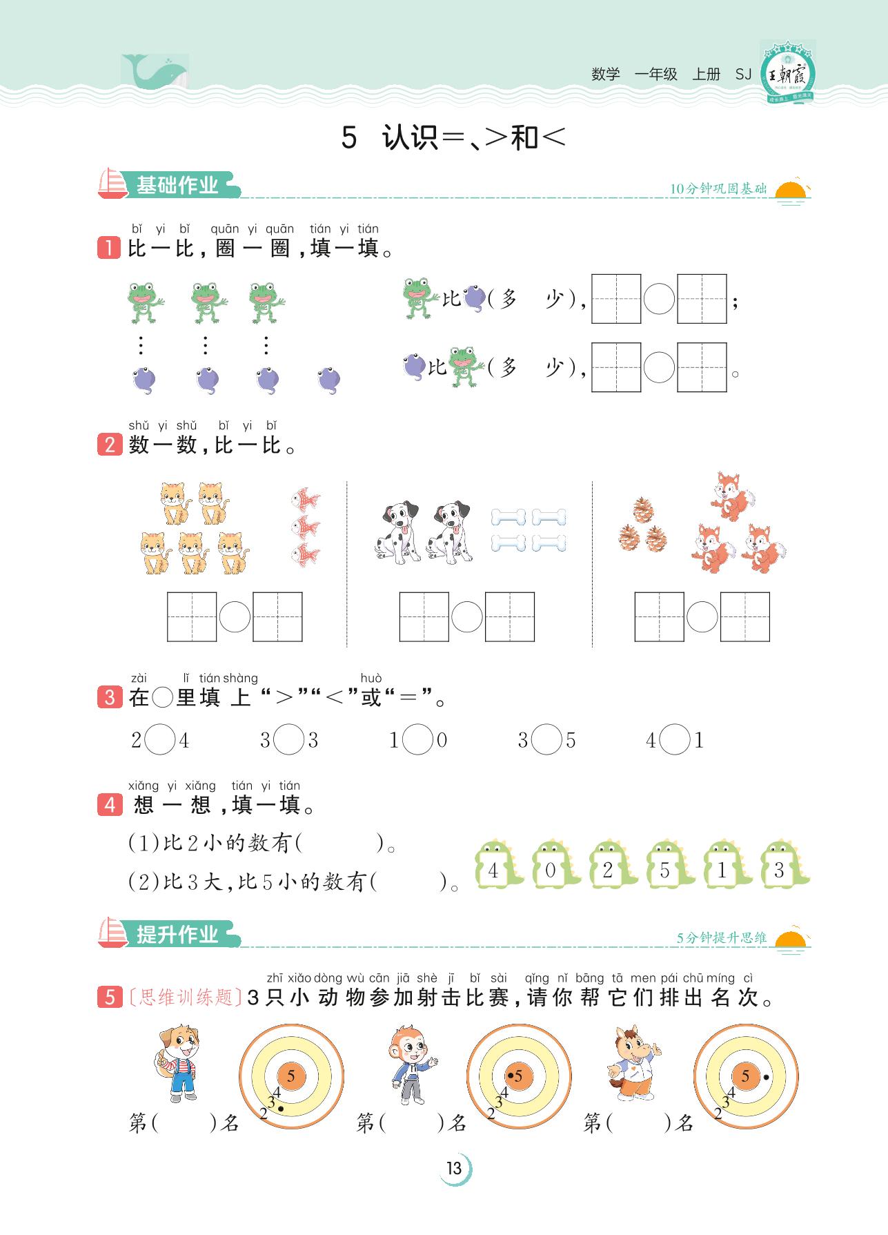 2023上册一年级数学苏教版 第五单元 认识10以内的数——5 认识=、>和<