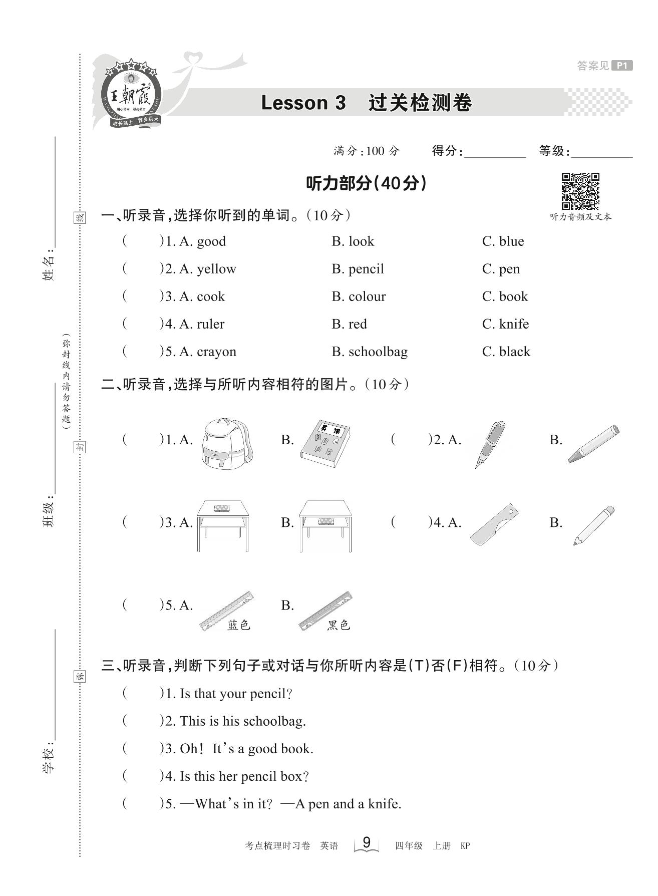 2023上册四年级英语科普版 Lesson 3 过关检测卷