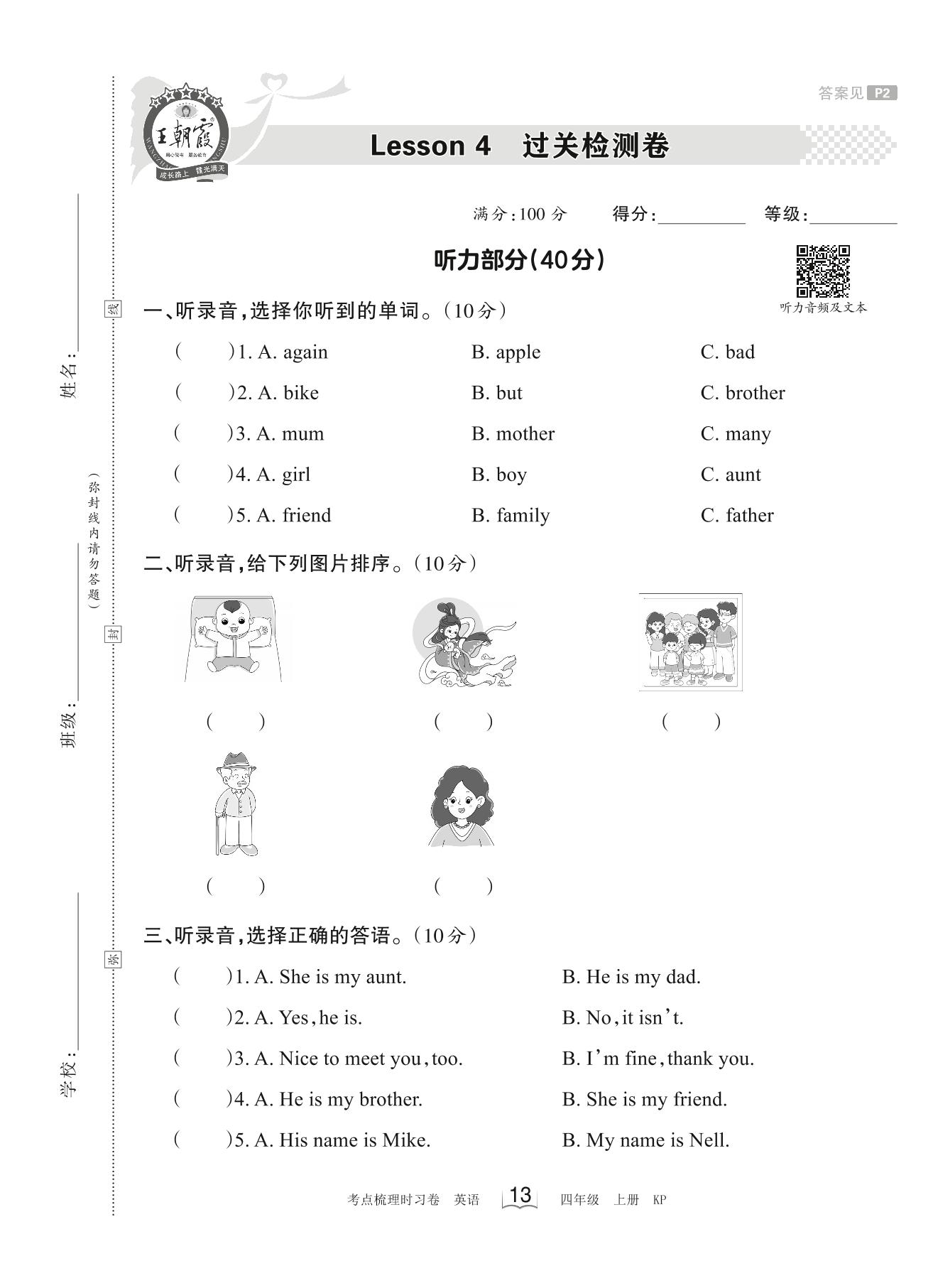 2023上册四年级英语科普版 Lesson 4 过关检测卷
