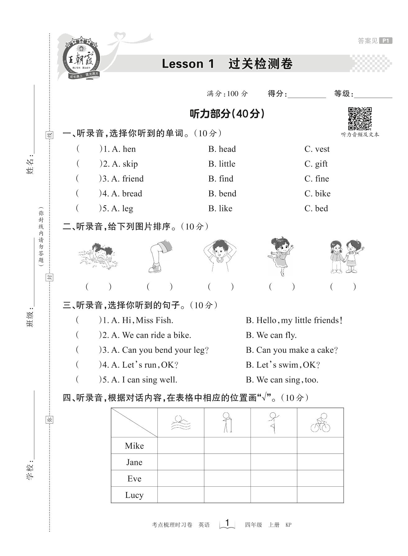 2023上册四年级英语科普版 Lesson 1 过关检测卷
