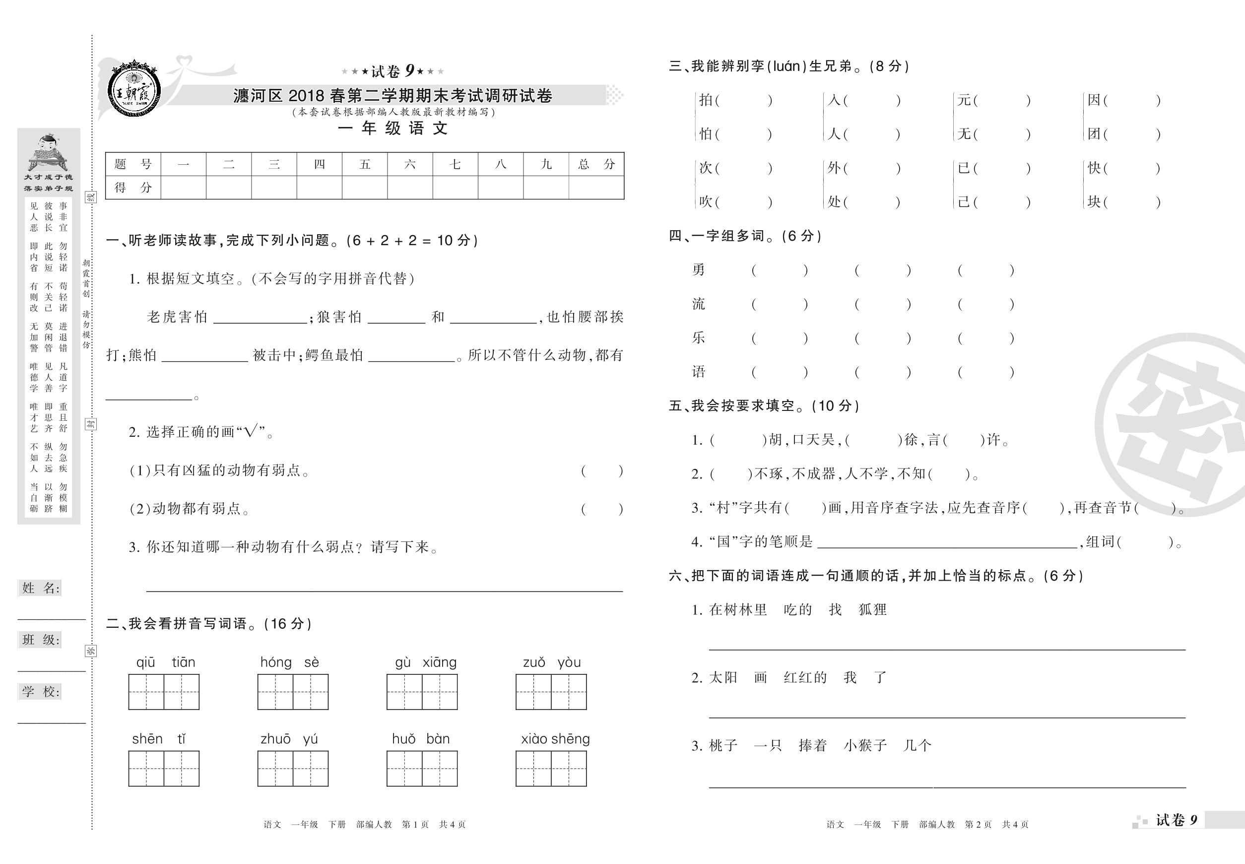2016-2017学年第二学期洛阳市瀍河区一年级语文试卷(人教版)【9】