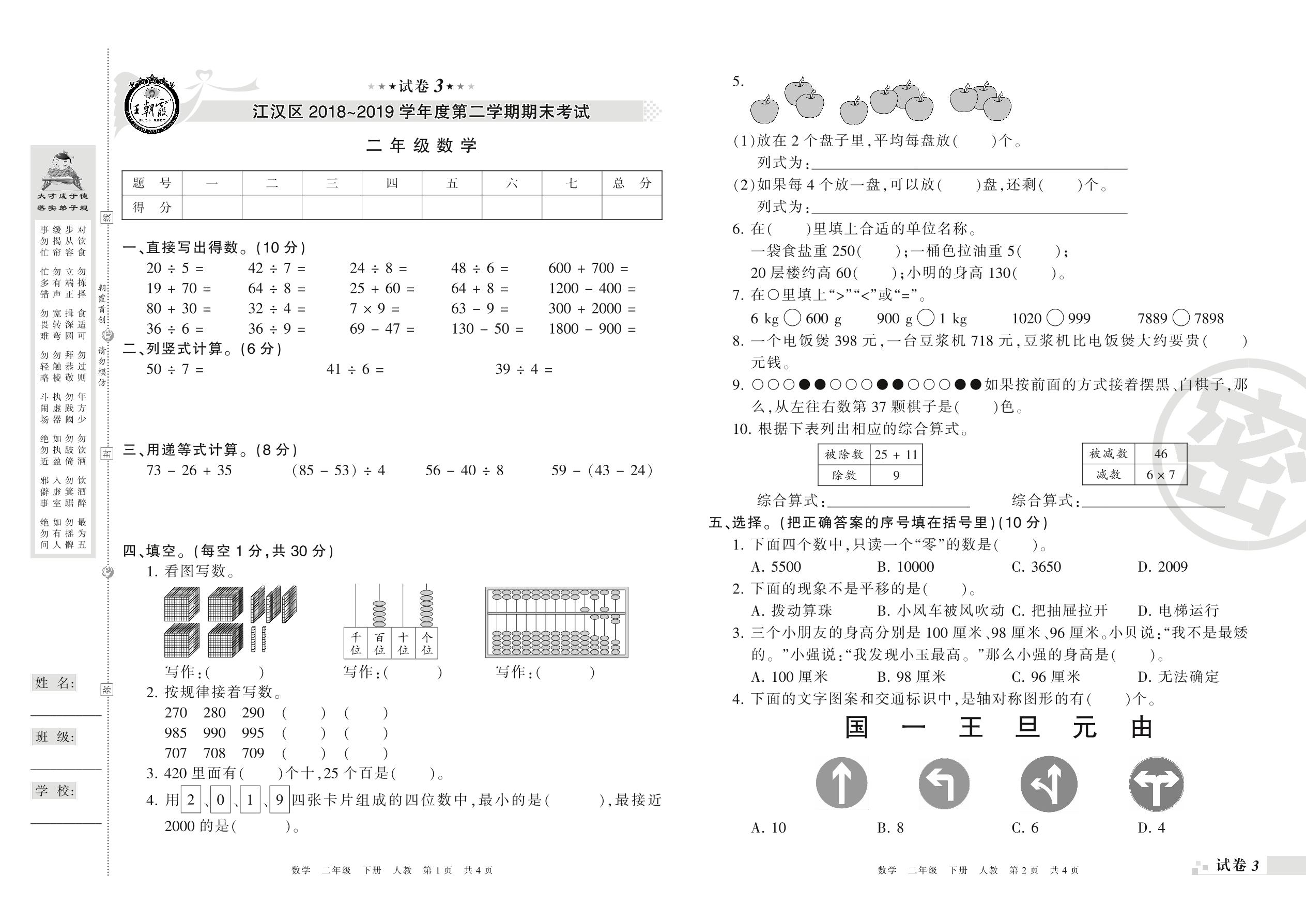 2018-2019学年第二学期武汉市江汉区二年级数学试卷(人教版)【3】
