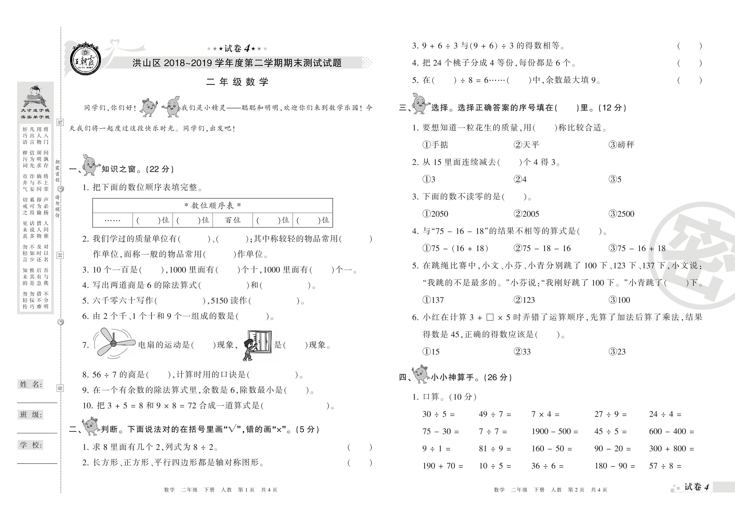 2018-2019学年第二学期武汉市洪山区二年级数学试卷(人教版)【4】