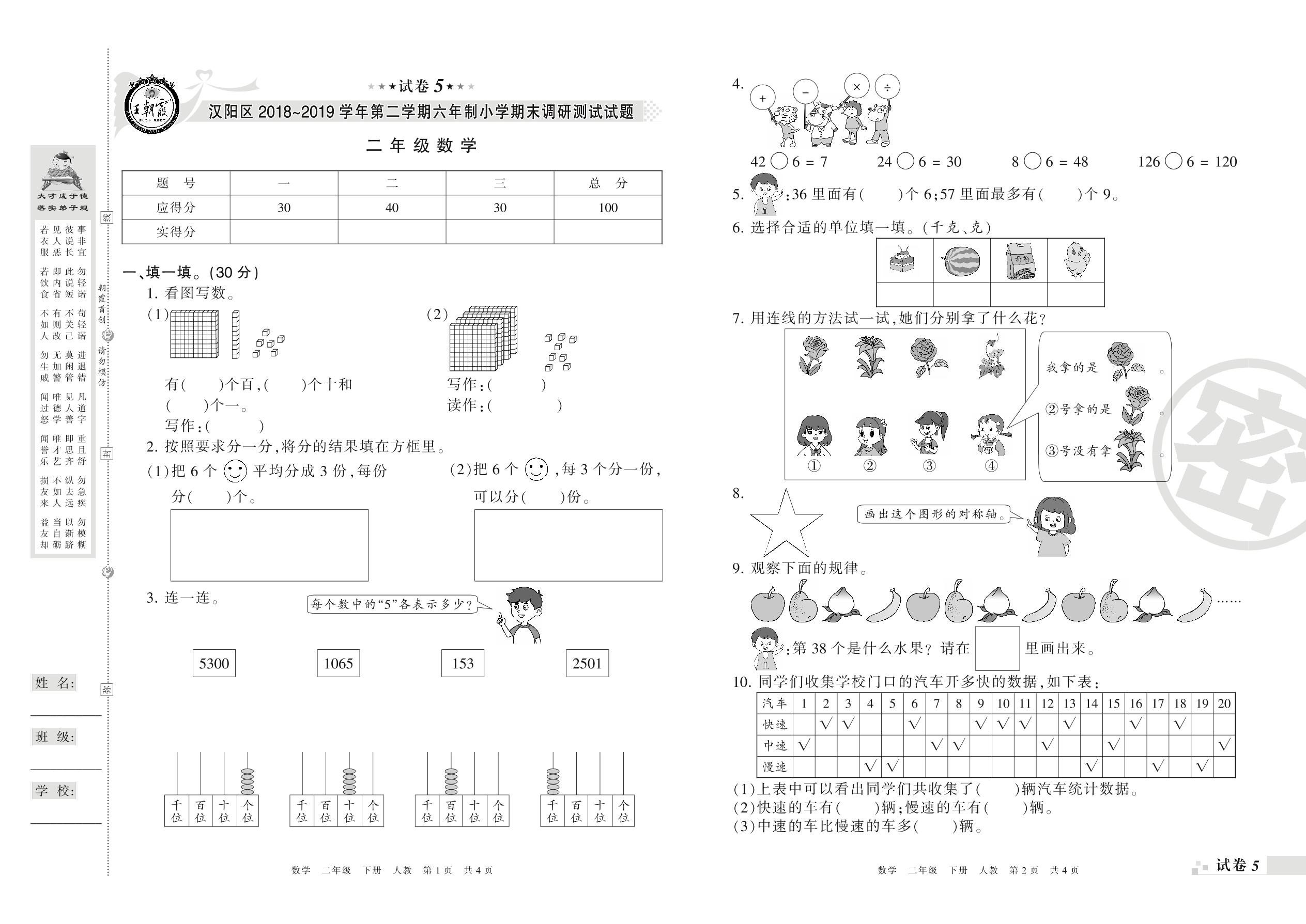 2018-2019学年第二学期武汉市汉阳区二年级数学试卷(人教版)【5】