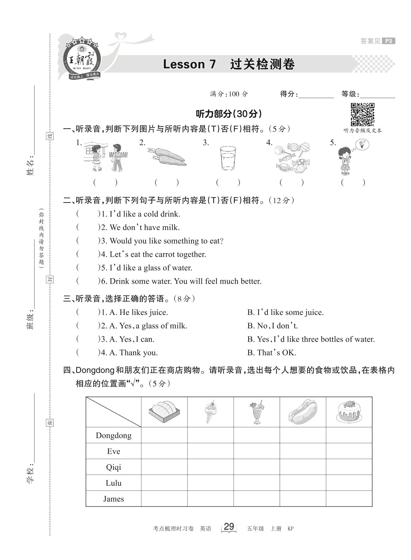 2023上册五年级英语科普版 Lesson 7 过关检测卷