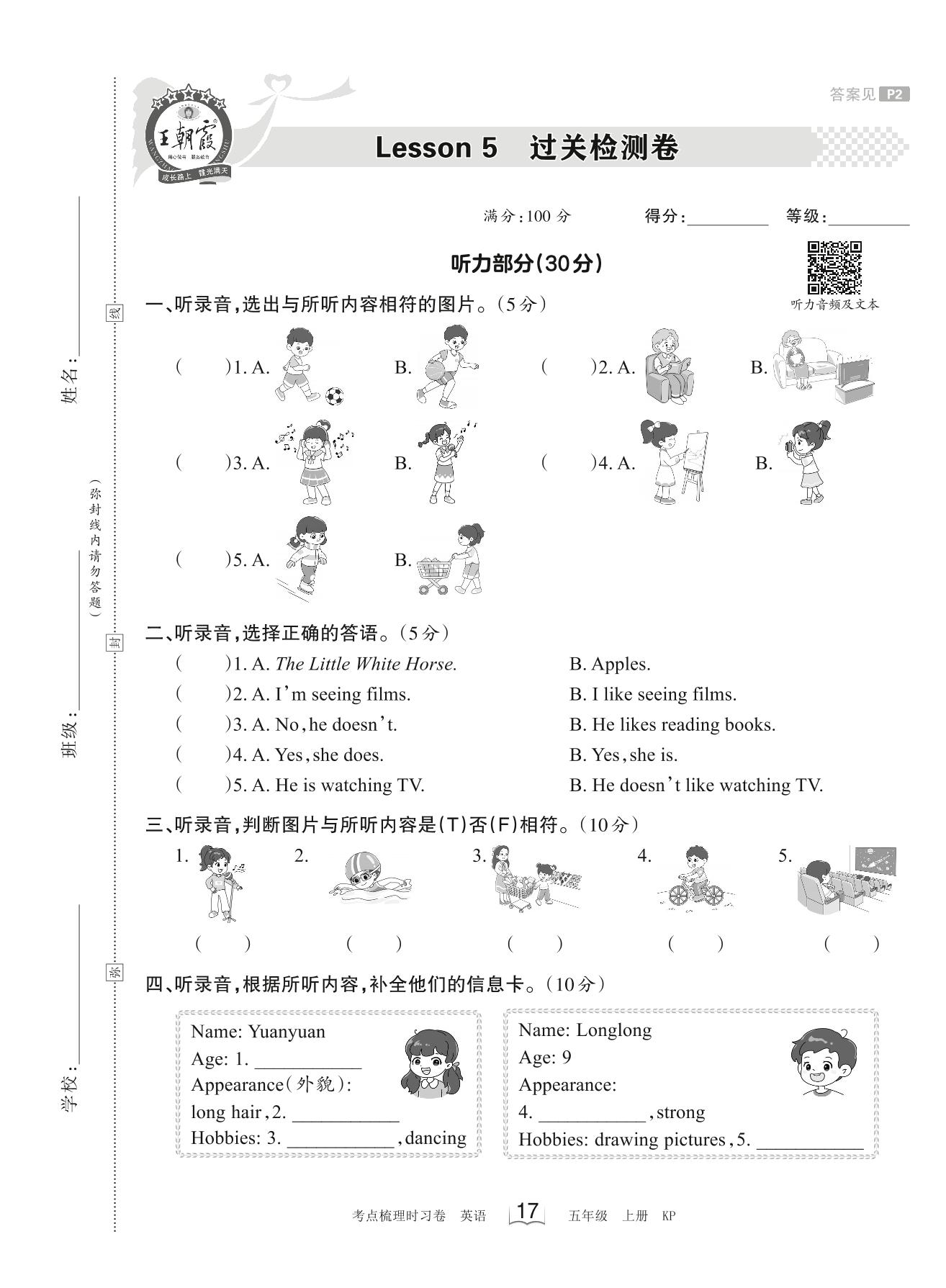 2023上册五年级英语科普版 Lesson 5 过关检测卷