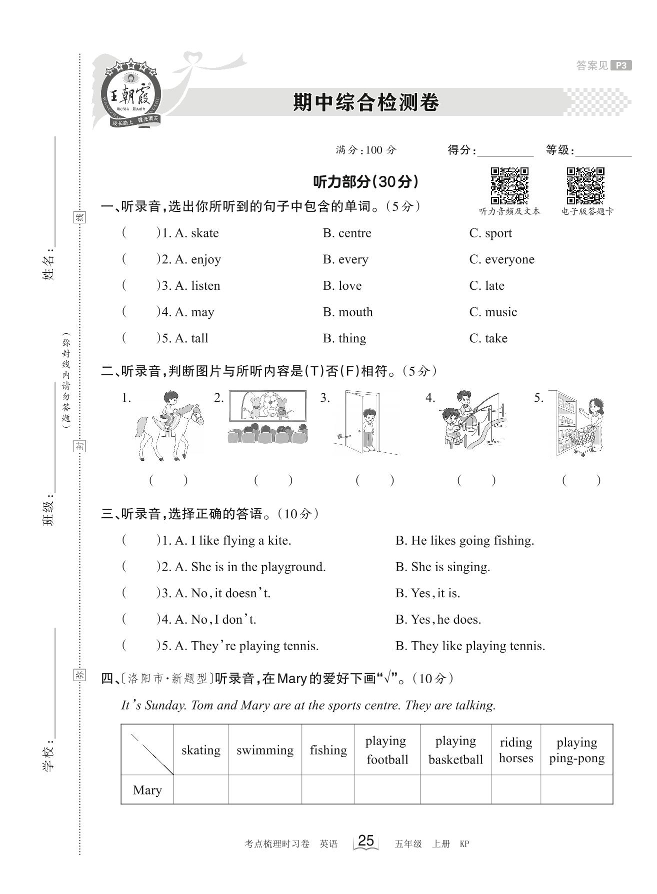 五年级英语科普版上册期中卷