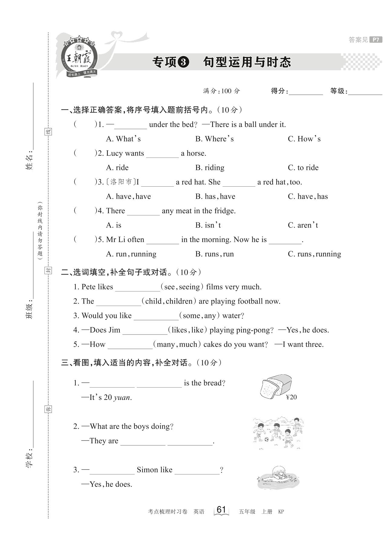 2023上册五年级英语科普版 专项3 句型运用与时态
