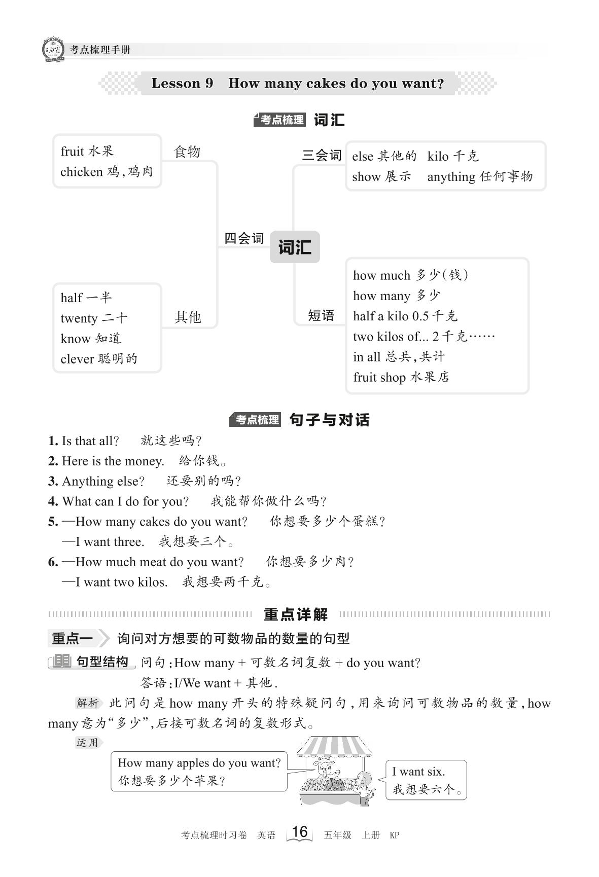 2023上册五年级英语科普版 考点梳理手册——Lesson 9 How many cakes do you want?