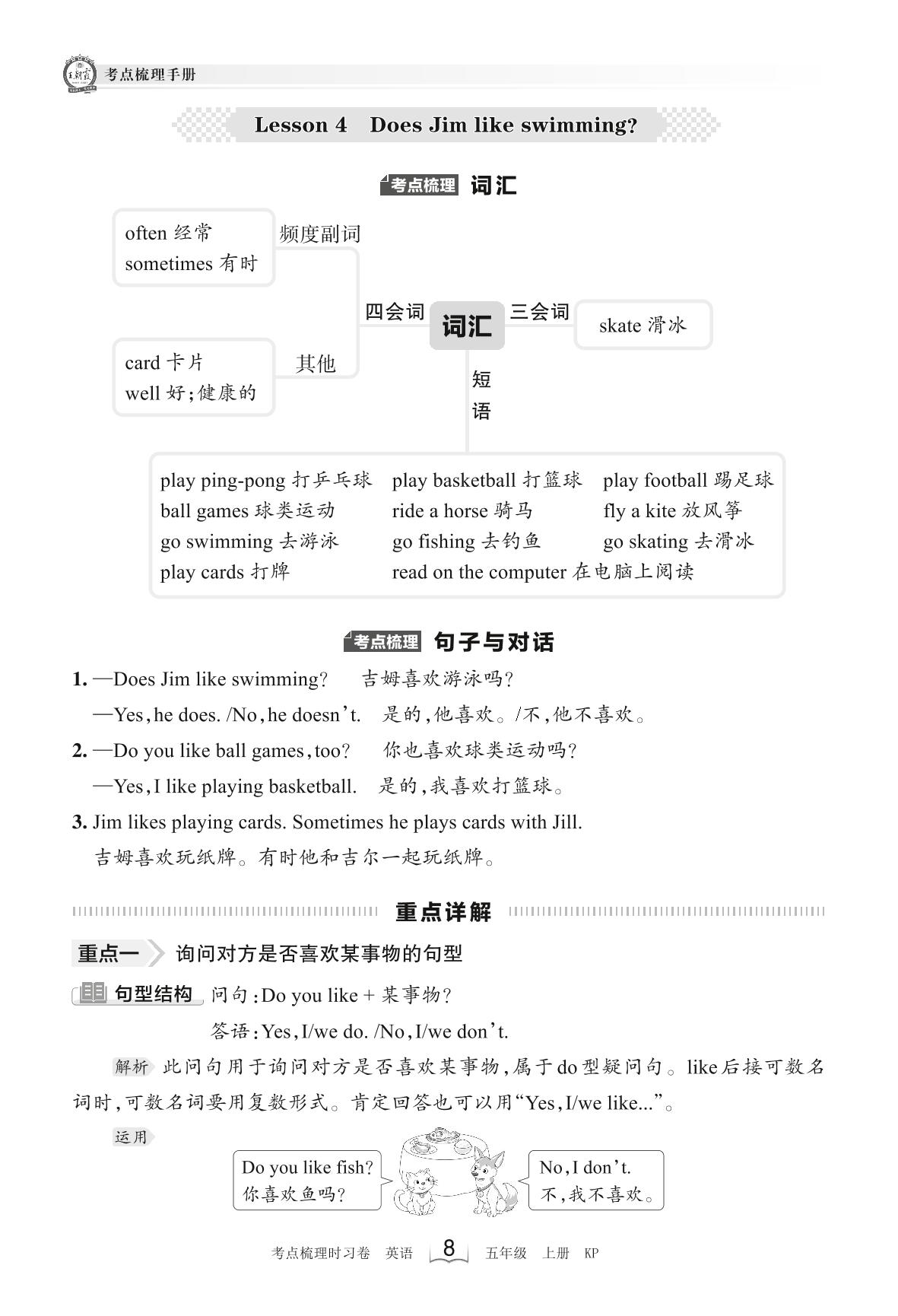 2023上册五年级英语科普版 考点梳理手册——Lesson 4 Does Jim like swimming?